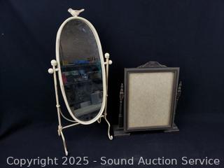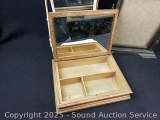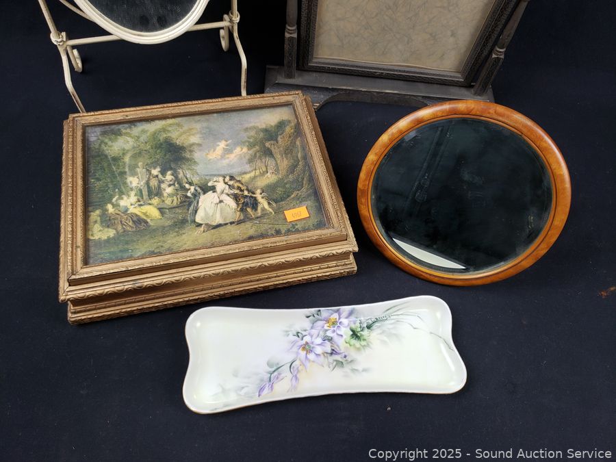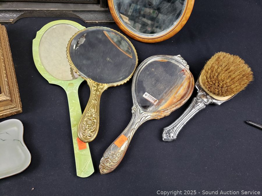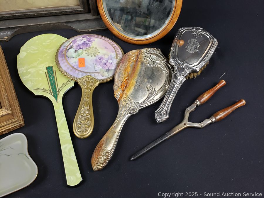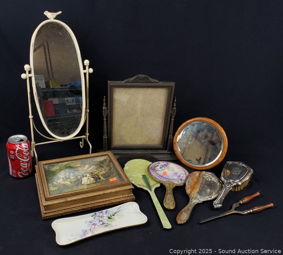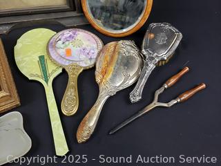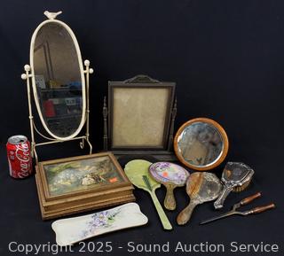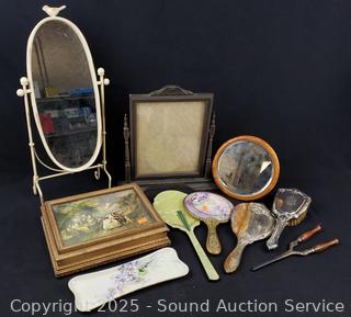 Vintage curler, brush, vanity mirrors, picture frame, trinket box. Refer to photos for lot contents, more details.