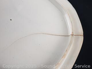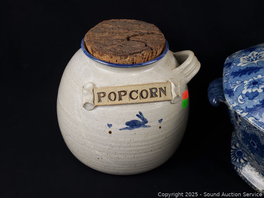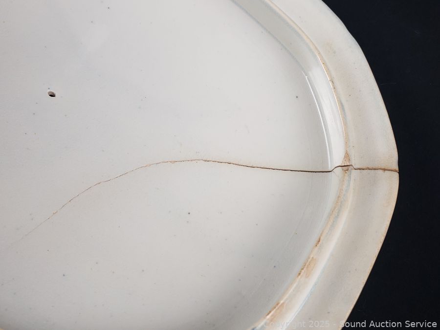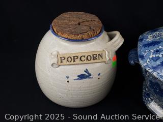 Soup tureen w/ladle (looks very old, lid is cracked), 6 Royal Winton Snack Plates, Miniature tea set made in England, signed pottery popcorn pot, olde Booths appetizer server (various crazing).