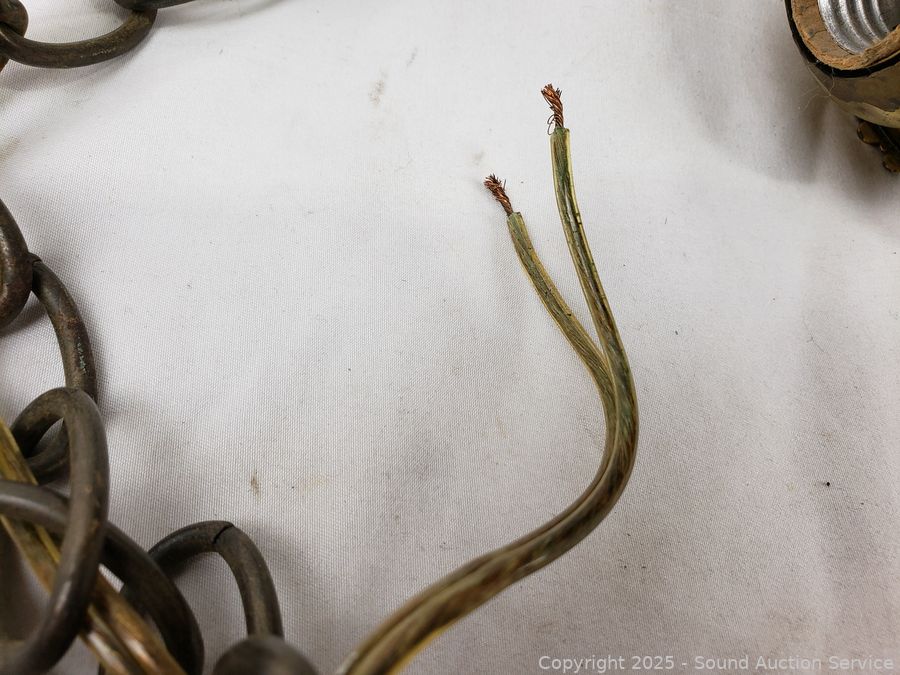 Hard wired, no plug. 16" H x 11" W x 8" lamp, 28" chain. Works.