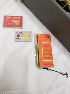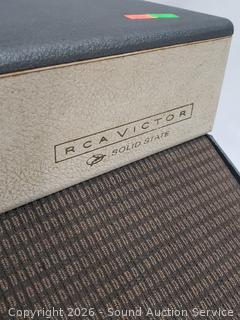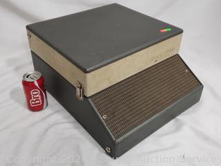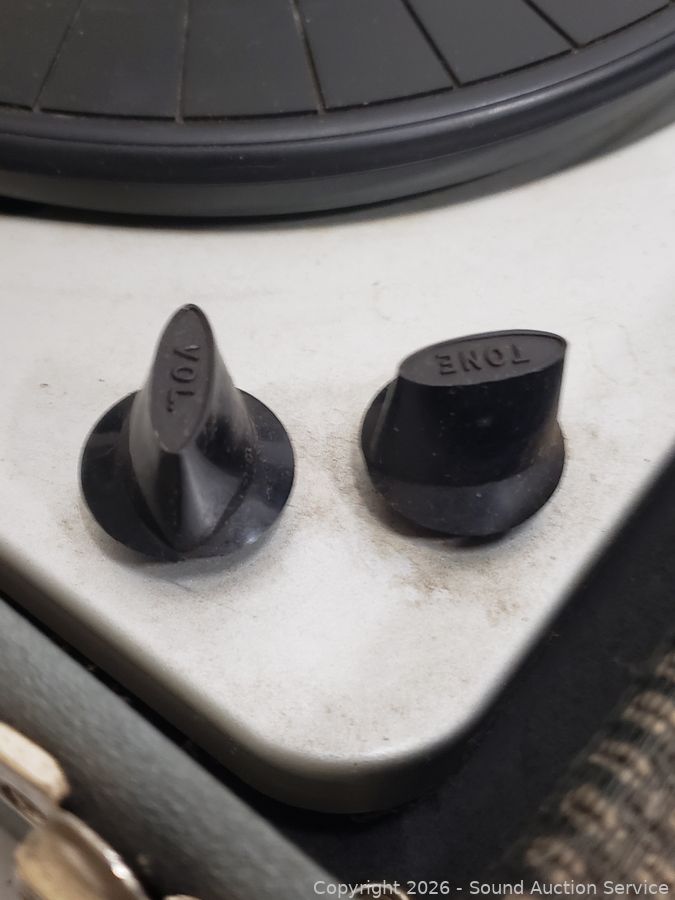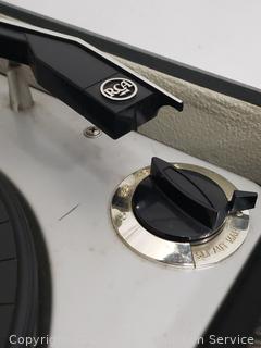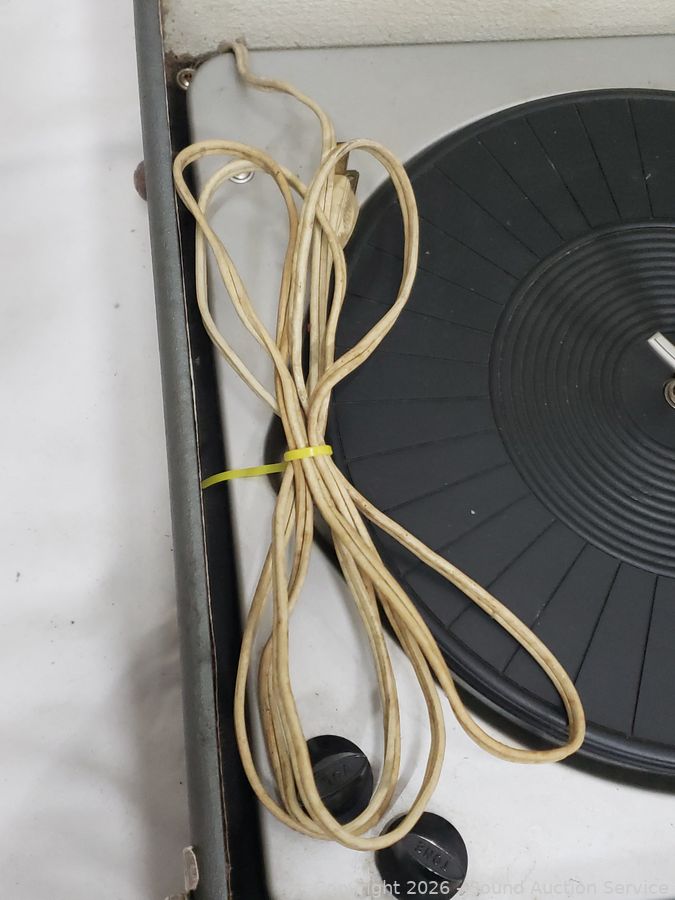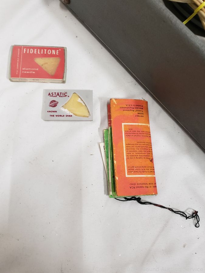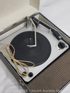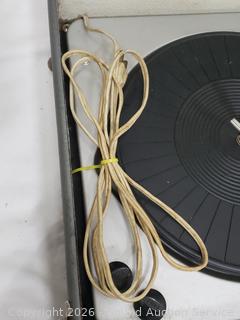 Has power, unit is producing a loud hum, non-functioning, no needle, volume knob has no effect. Table does not turn, case has wear, damage. Empty needle packages inside.