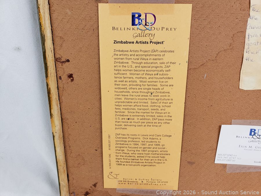 One of a kind, Personalized on the reverse with original purchase receipt. Signed by artist Wajasi Alama Weya Zimbabwe. 16.75" x 20.75".