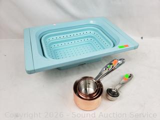Lot #0305: 6pc Teaspoon Set, 4 Measuring Cups & Silicone Collapsible Colander