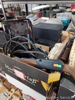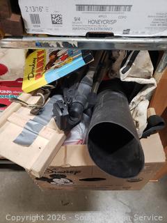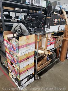 Cart not included. Books, candle sconces, electronic components, grease gun, pellet gun (not functioning), baseballs, etc. Refer to photos for lot contents more details. ATTN: All items are used, may be missing pieces, damaged, not functioning, complete, no issues, etc. All items as is. Refer to photos for more details.