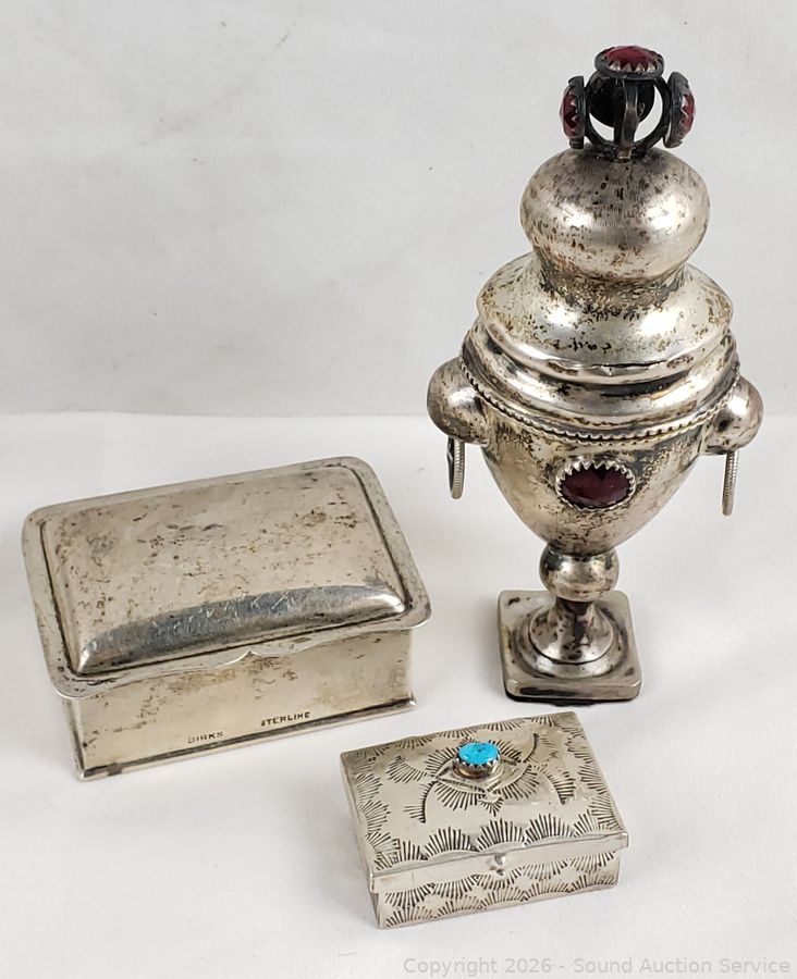 Lot #0107: Sterling Snuff Bottle & 2 Snuff Boxes
