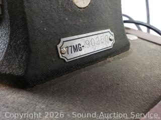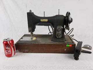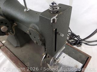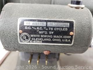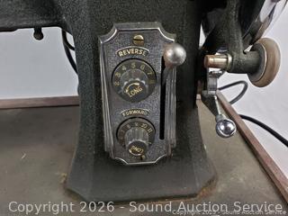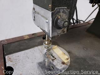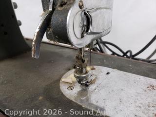 Has power, motor appears to be working as intended. No belt to drive needle. Various wear from age, use.