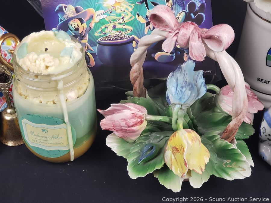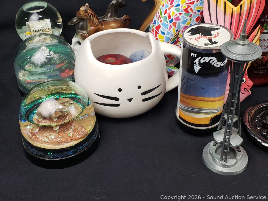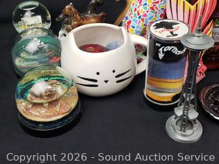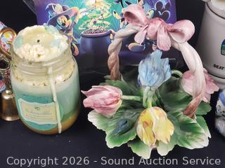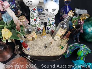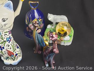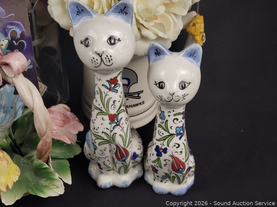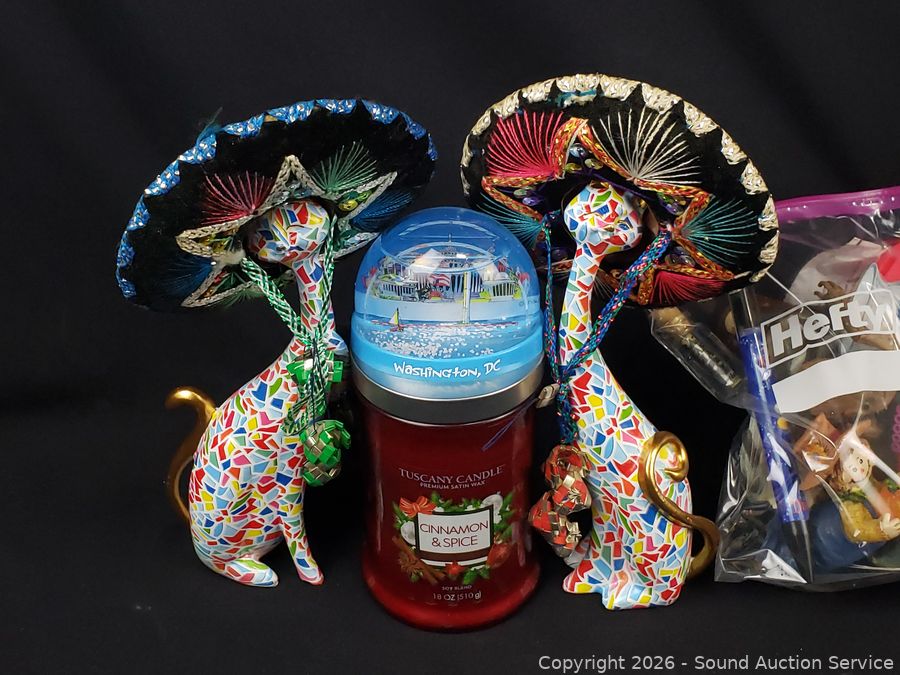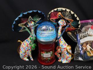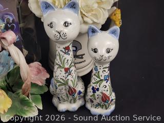 Wood & porcelain cat figures, Cinnamon Spice scented candle, Capodimonte & Avon porcelain flower figures, miniature sombreros, paperweights, etc. Refer to photos for lot contents, more details.