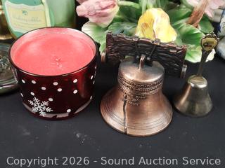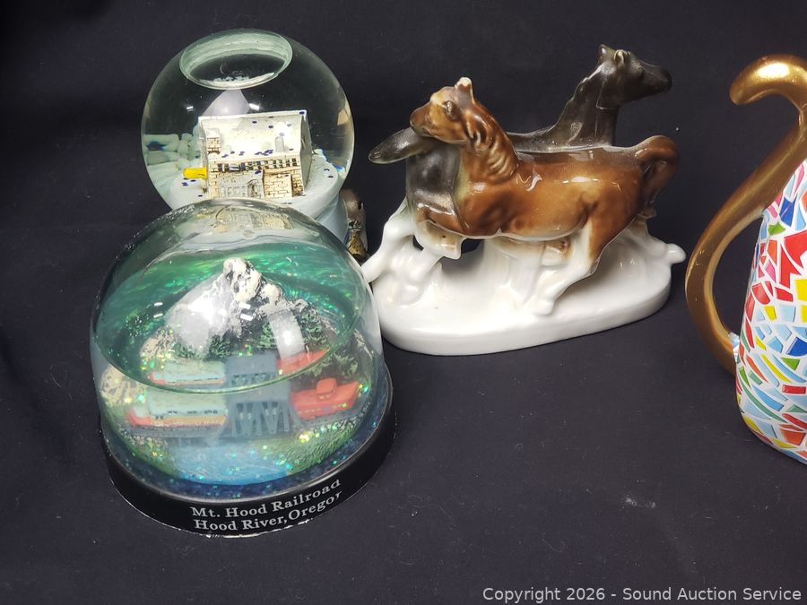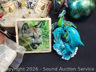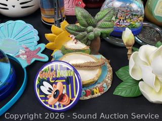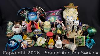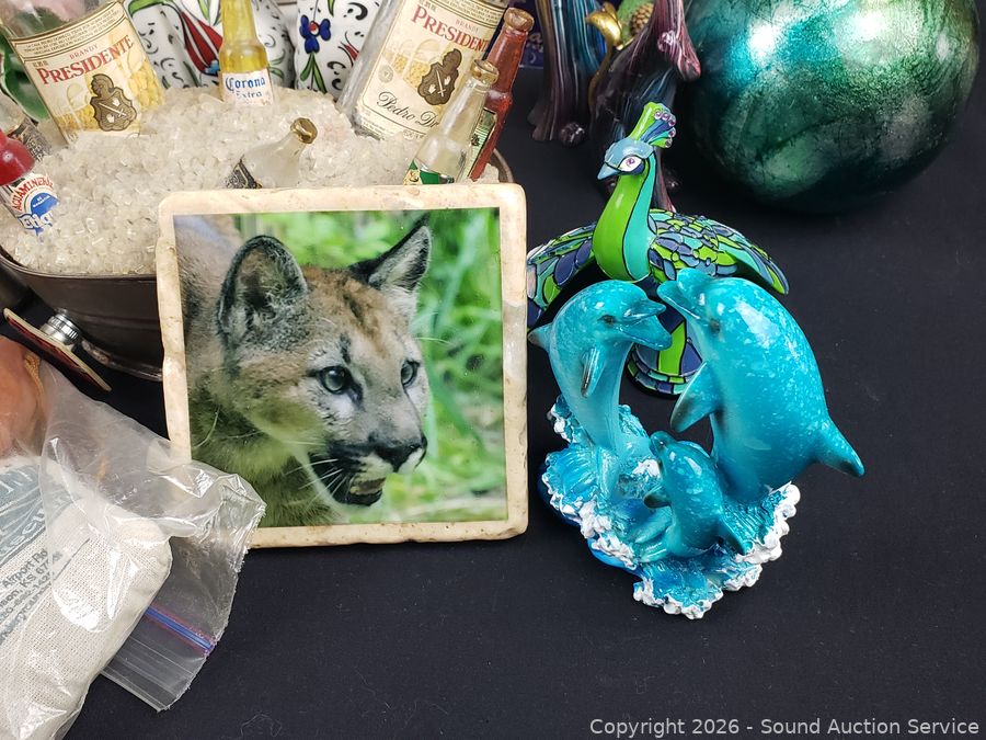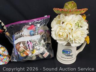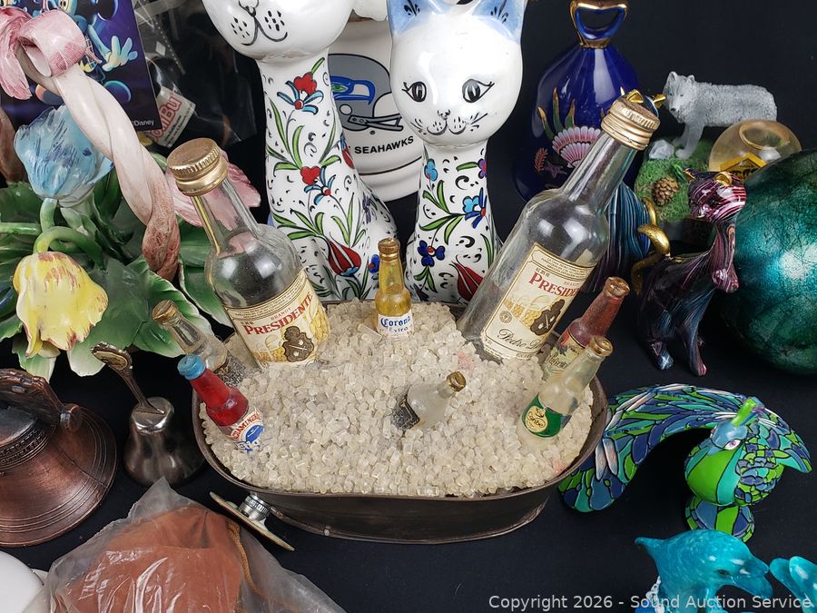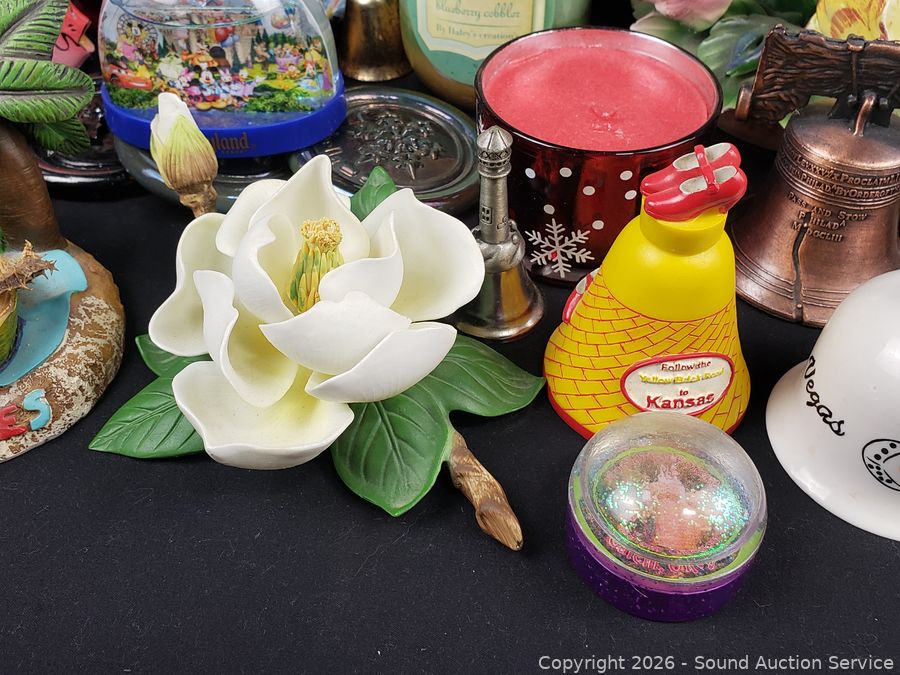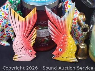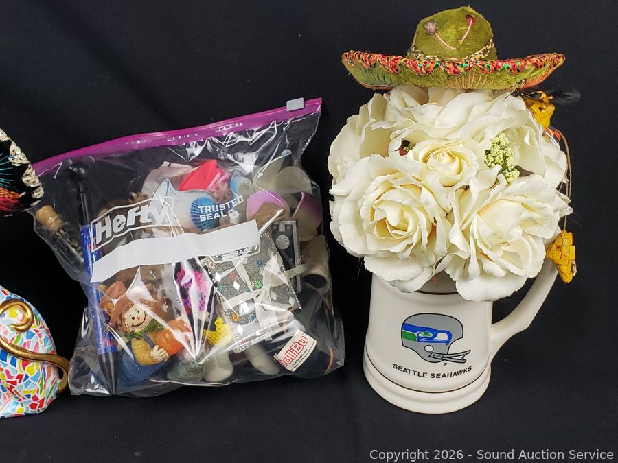 Wood & porcelain cat figures, Cinnamon Spice scented candle, Capodimonte & Avon porcelain flower figures, miniature sombreros, paperweights, etc. Refer to photos for lot contents, more details.