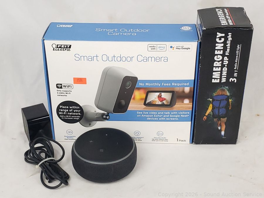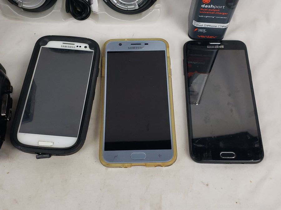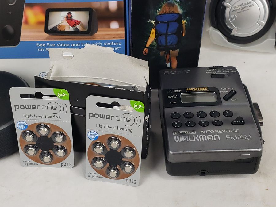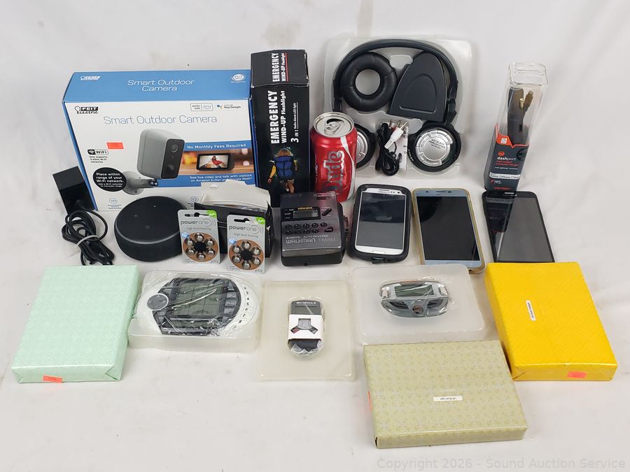 All are untested. Dashport Dual Outlet Universal Charger, Smart Outdoor Camera, 3 Samsung Smart Phones, Emergency Windup Flashlight, P312 Hearing Aid Batteries, Sony Walkman Cassette Player, Amazon Echo Dot. Refer to photos for lot contents, more details.