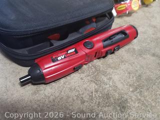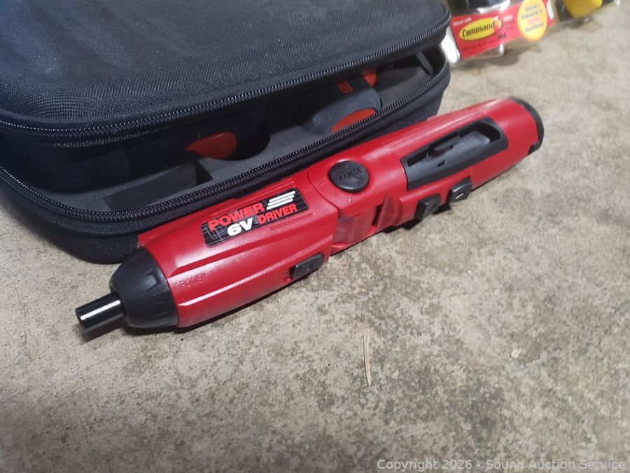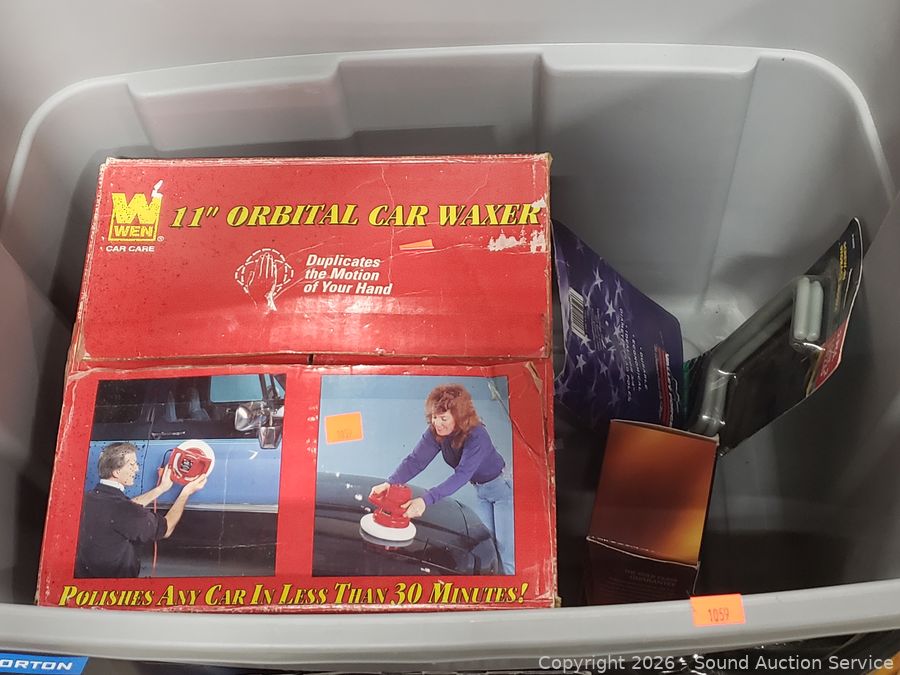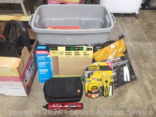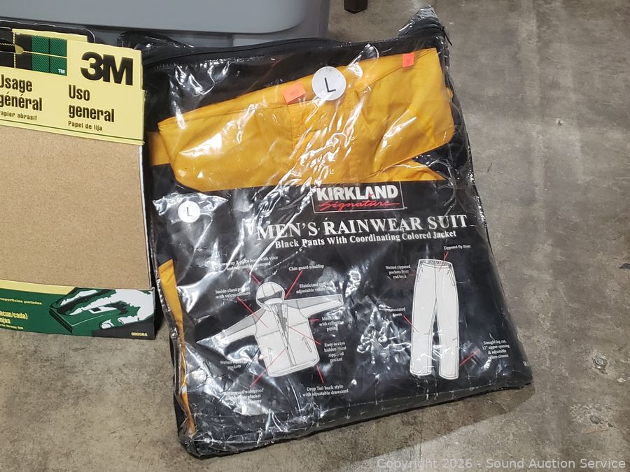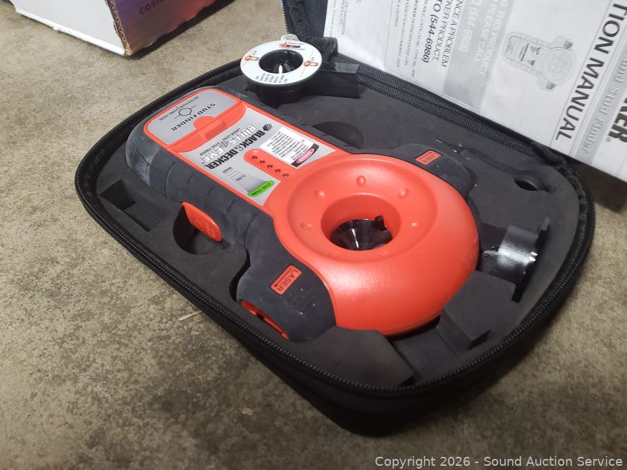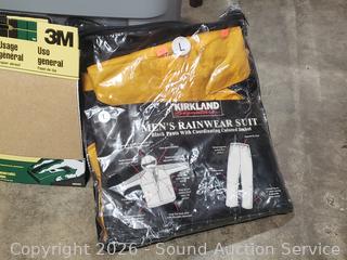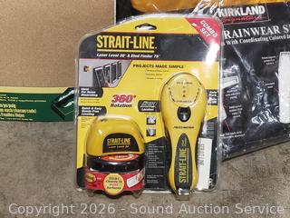 Kirkland Men's Rainsuit S:L, Car Wax, Straight-line laser level & stud finder, Wen buffer, 6V cordless screwdriver (takes AA batteries, works), Black & Decker Bullseye laser level stud finder (missing a piece). All appear to be functioning as intended.
