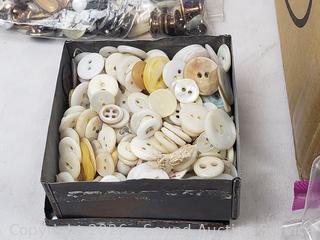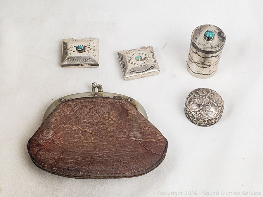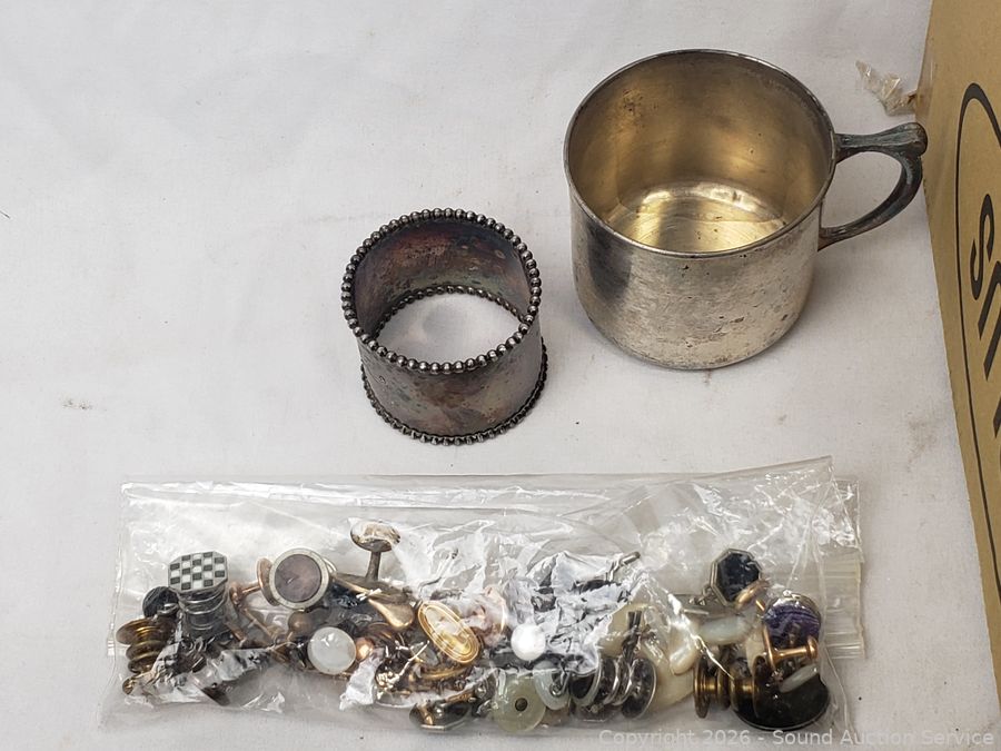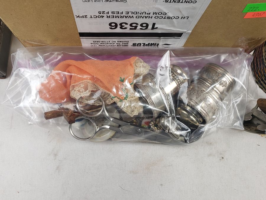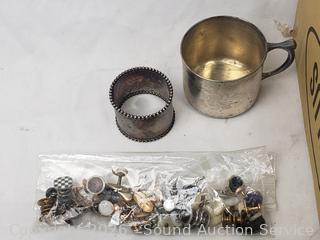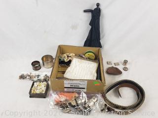 Salt & pepper, napkin rings, scissors, belts, hair clip, antique tin full of buttons, cufflinks, beaded clutch, military medals, dog tags, baby cup, etc.