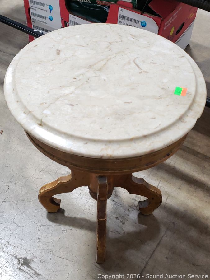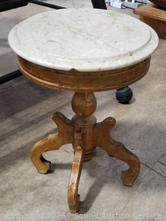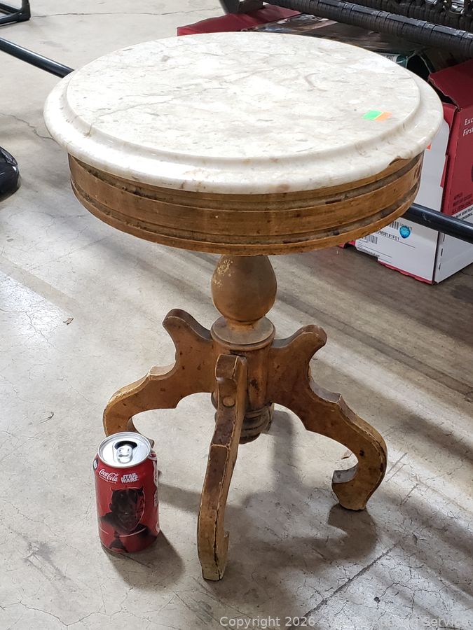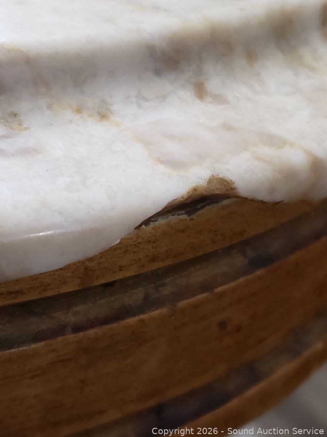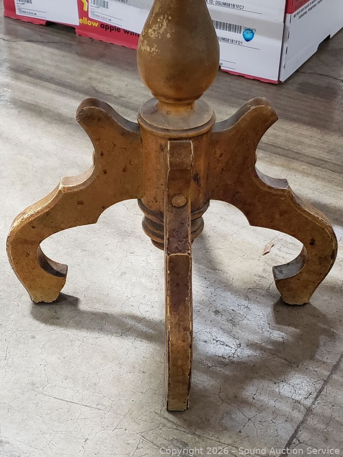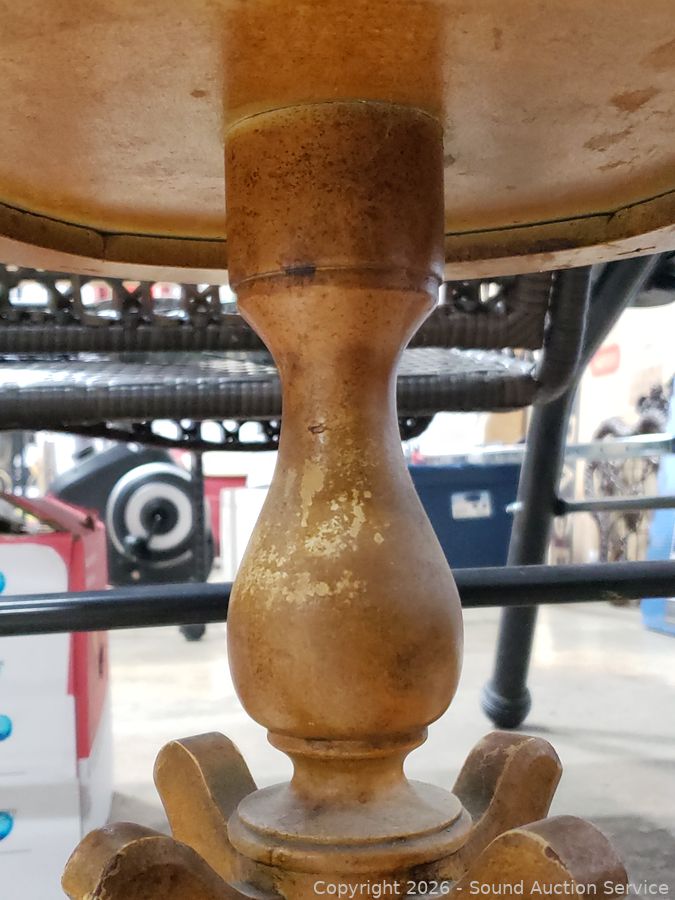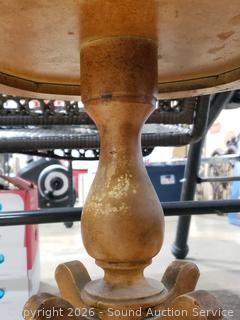 See 2 large chips on edge. 19" H x 14" Dia. Various wear to finish on the base.