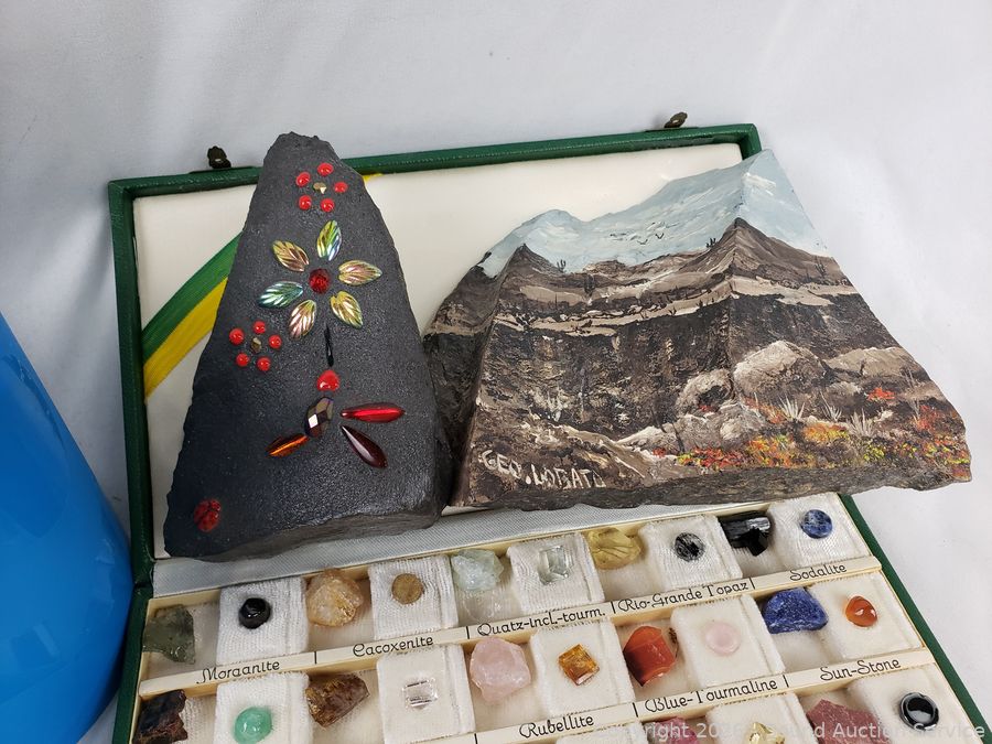 Pyrite (fools gold), Polished, Cut & Raw stone set, Signed Painted Stone, various other polished & raw stones.