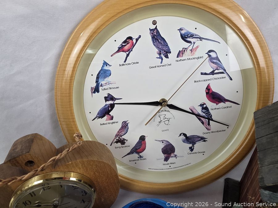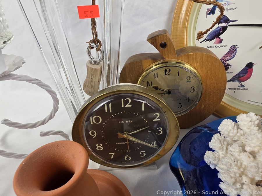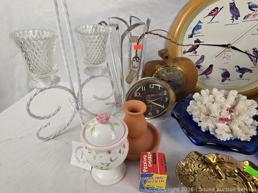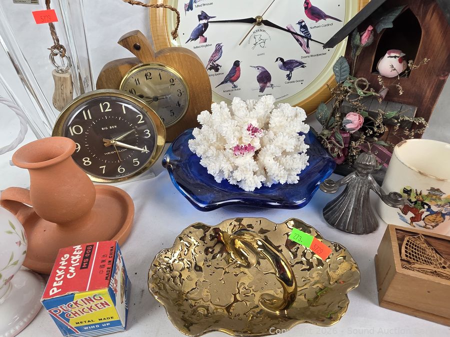 Bird clock, vase, handled basket, coral, compote, Bell-Terr gold dish, etc. Refer to photos for lot contents, more details.