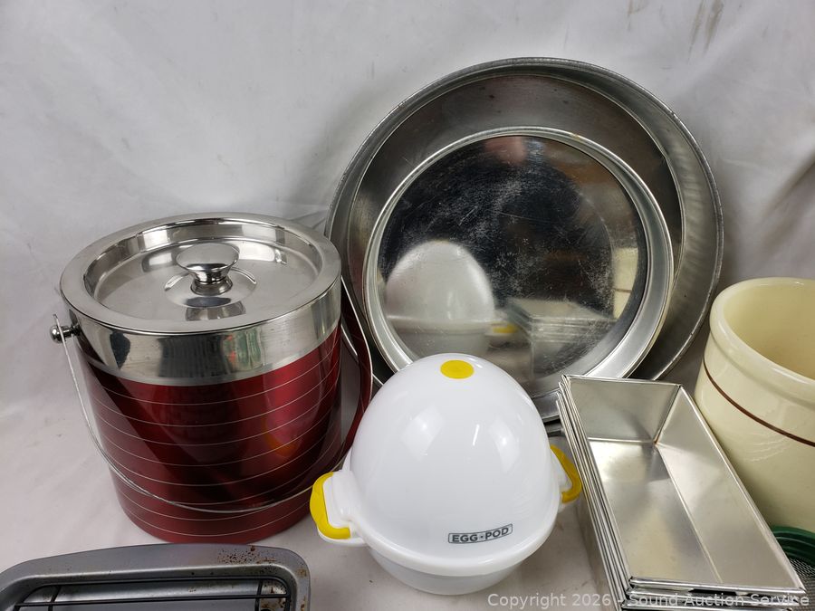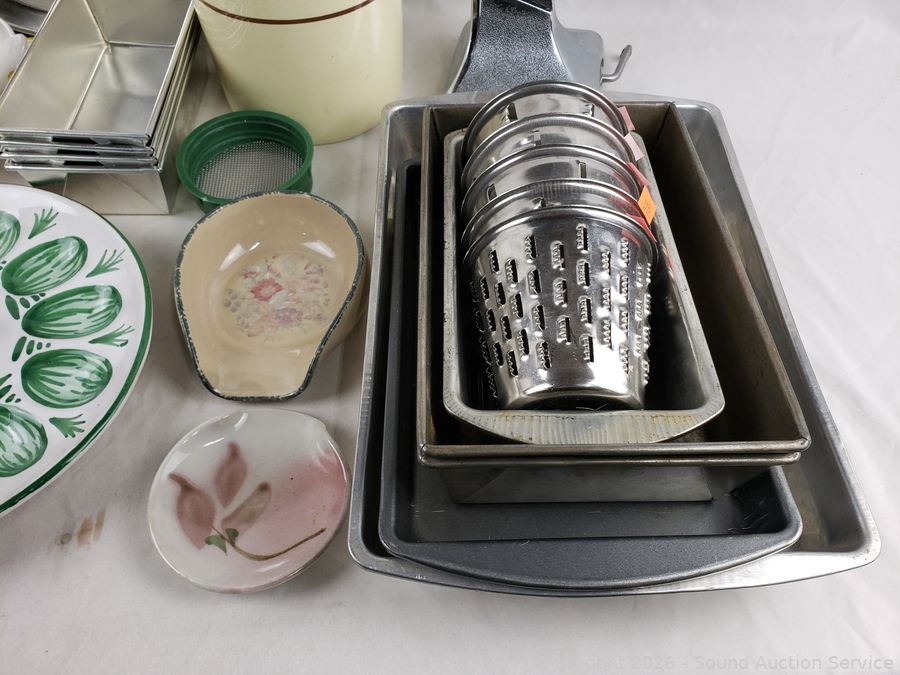 Baking pans, deviled egg holder, food chopper, pottery container, etc. Refer to photos for lot contents, more details.