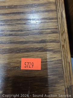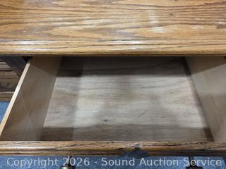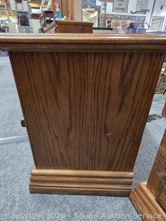 Particleboard construction, oak veneer finish. Some scuffs, wear to finish. Matches the previous & next lots. 23" H x 24" W x 16" D.