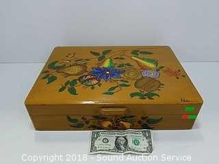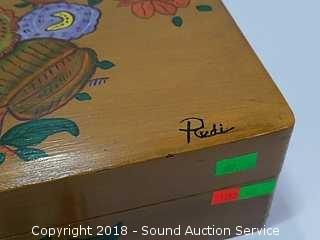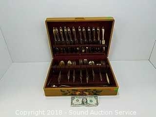 In a beautiful genuine Dirilyte hand painted and signed flatware chest, signed Rudi. Flatware is either brass or gold plated, please use your own judgement.