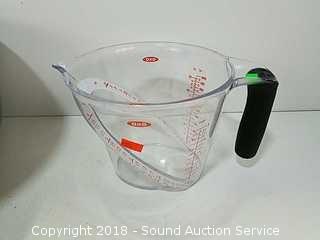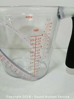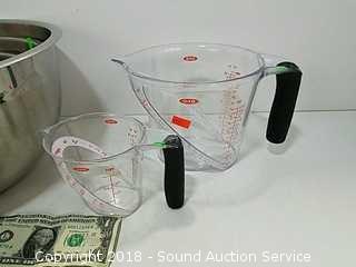 Mixing bowls are stainless, 3qt, 5qt & 8qt. Measuring cups are plastic, by OXO. Refer to photos for more information.