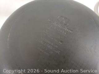 2qt & 3qt, 11" & 12" skillets, 8qt boiling pot signs of wear from use, good condition.