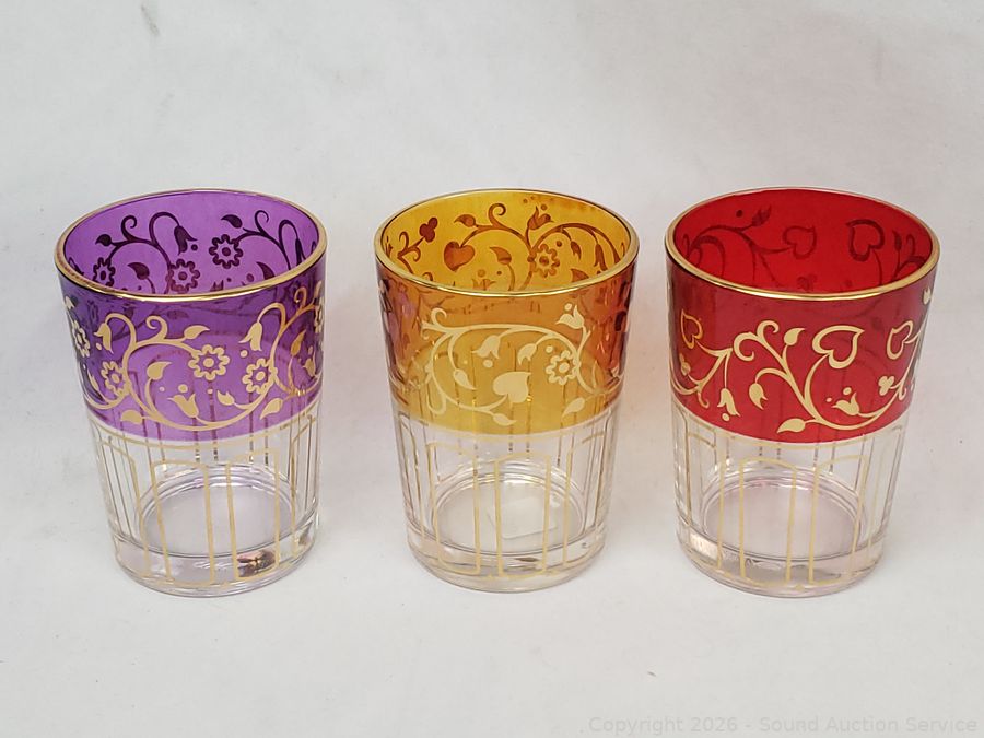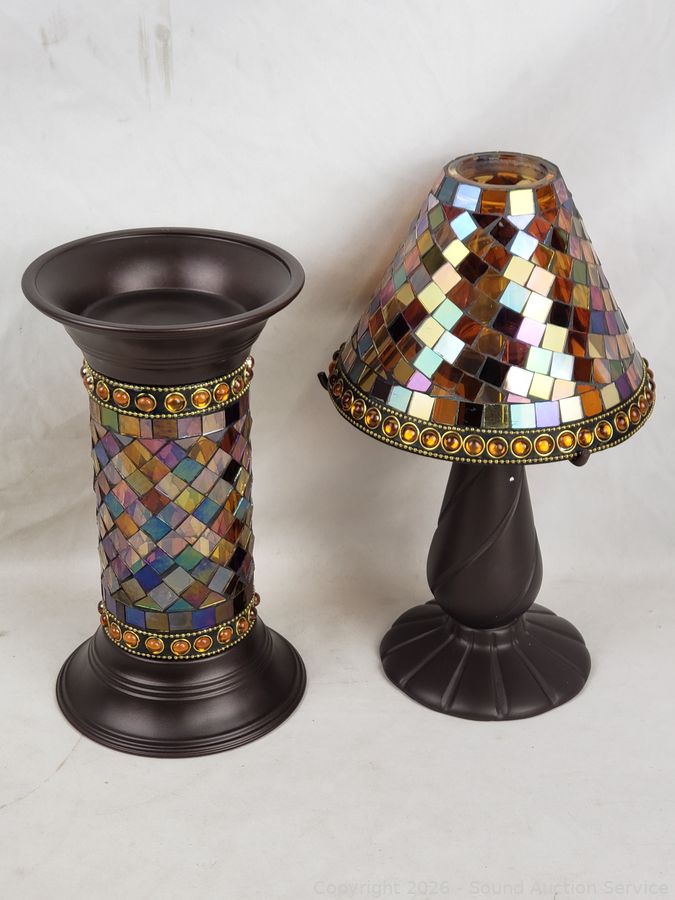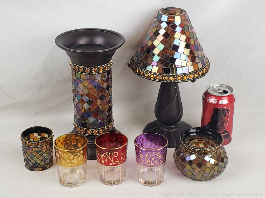 July 2008 Votive Cup, 3x Purple Red & Gold Votives, Nov. 2007 Votive, 9" Column, Candle Lamp. Refer to photos for lot contents, more details.