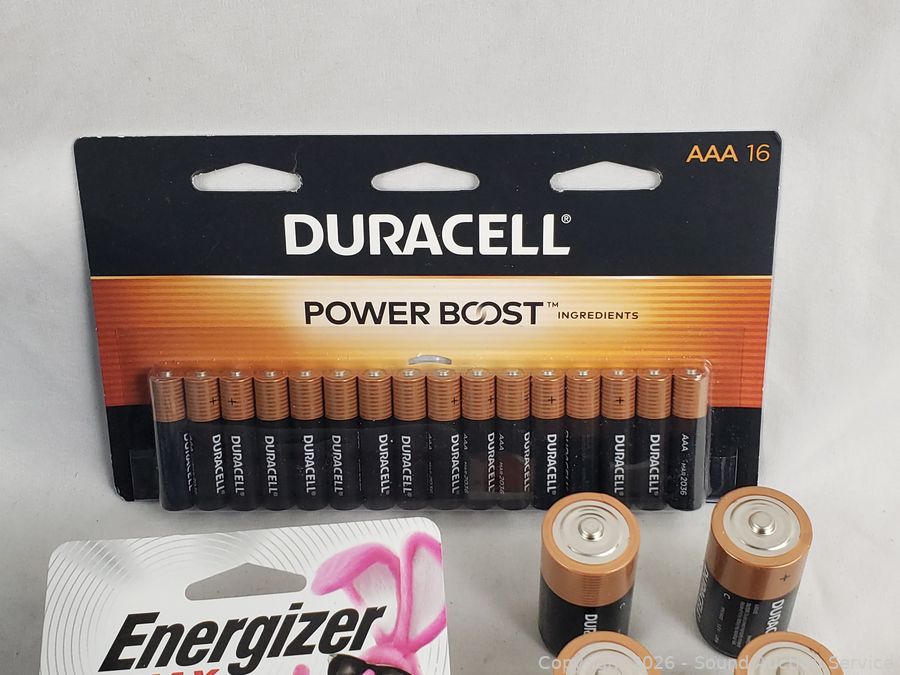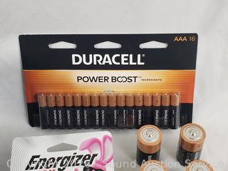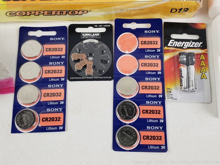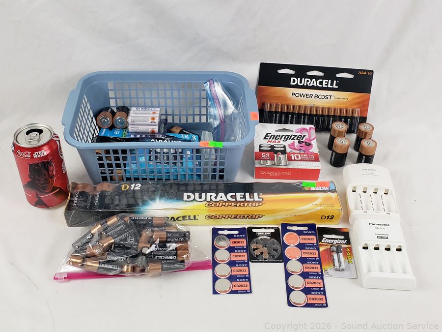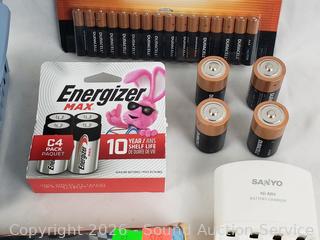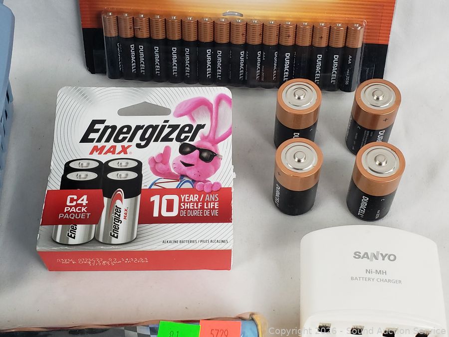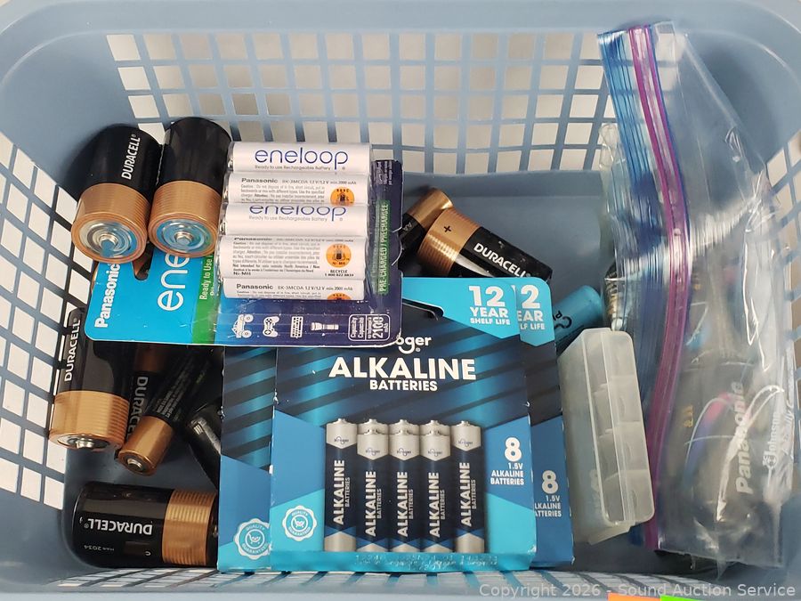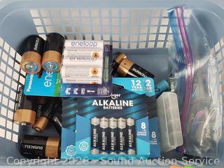 AA, AAA, AAAA, C, D, 2 wall chargers. Refer to photos for more details. Some appear sealed.