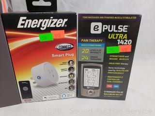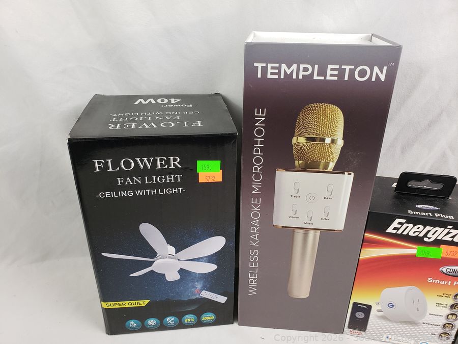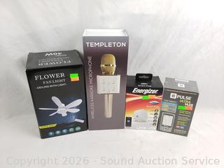 Wireless Karaoke Microphone, Pulse Ultra 1420, Energizer Smart Plug, Flower Fan Light. All in original packaging.