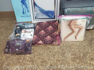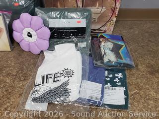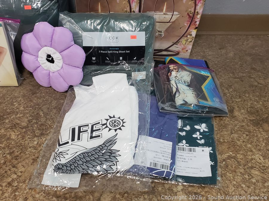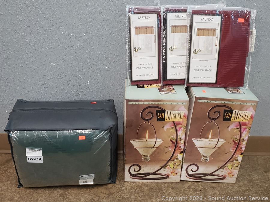 San Miguel Hanging Votives, Metro Curtains, Wine Charms, 7pc Split King Sheet Set, Sheer leggings, etc. Refer to photos for lot contents, more details.