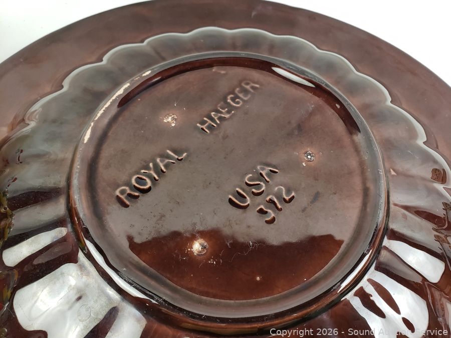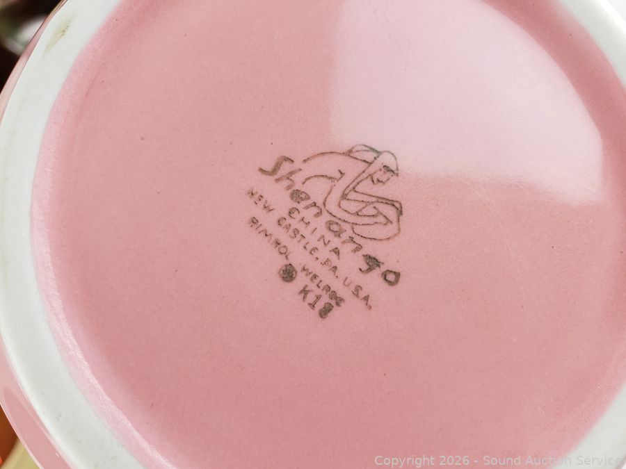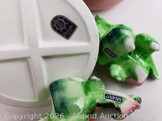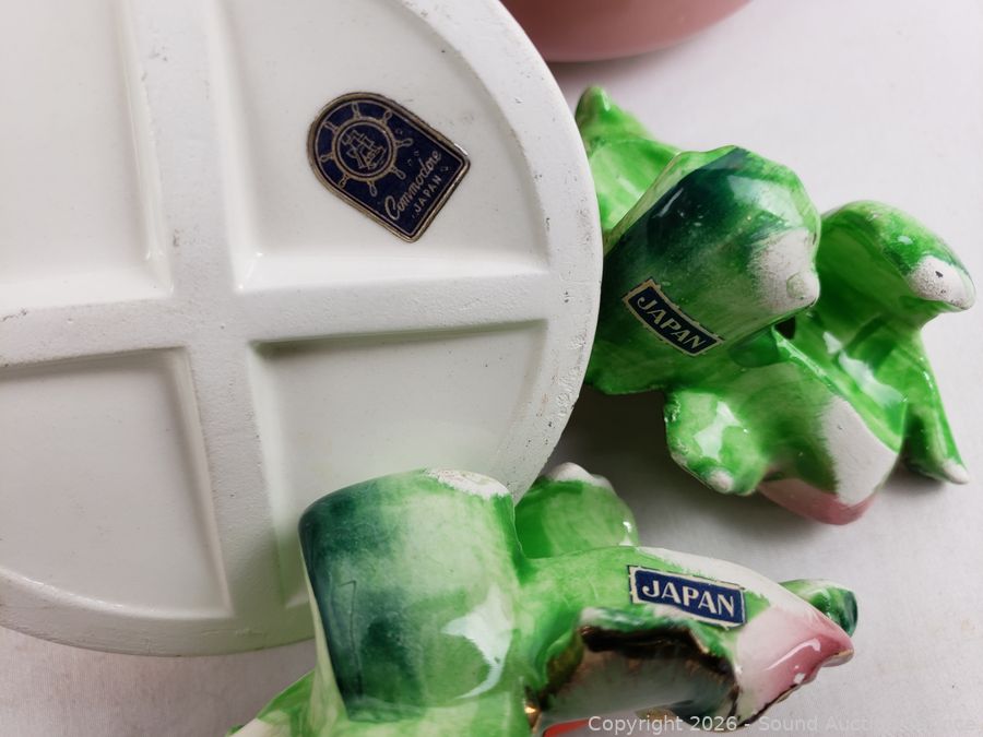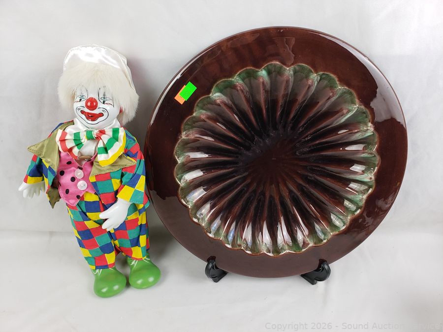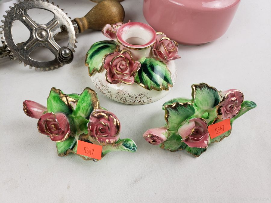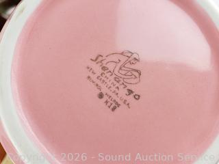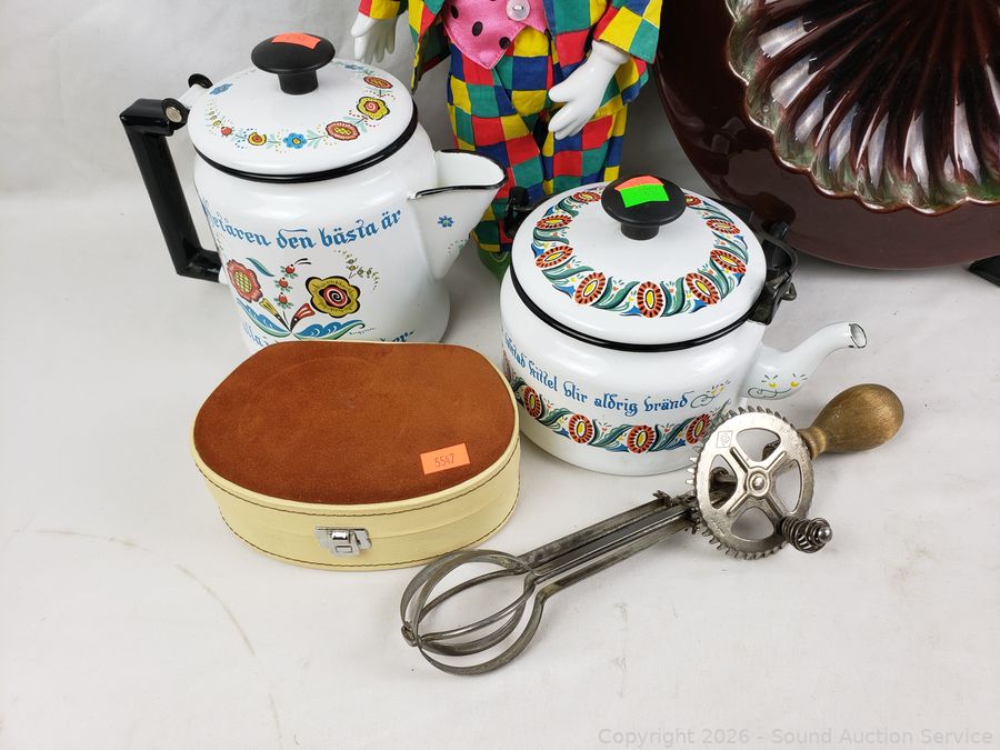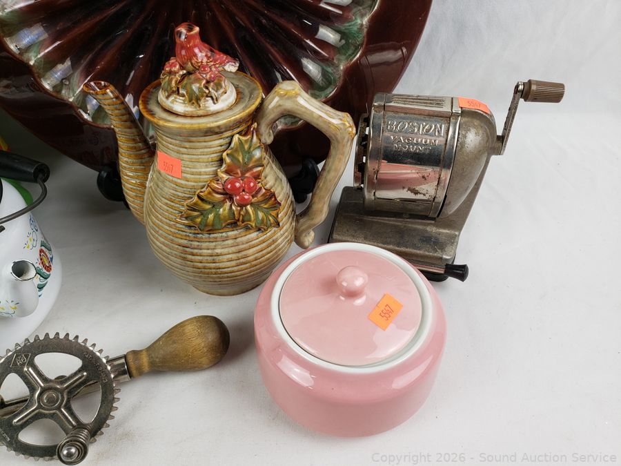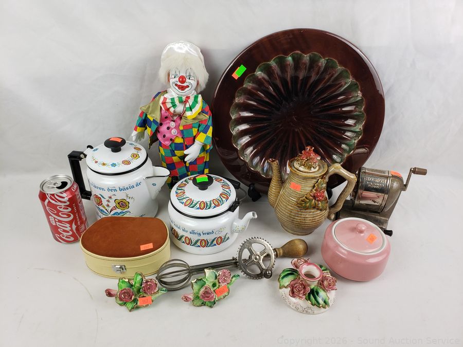 Haeger pottery bowl, enamelware pot & coffee pot, teapot, Boston pencil sharpener, hand mixer, clown figure.