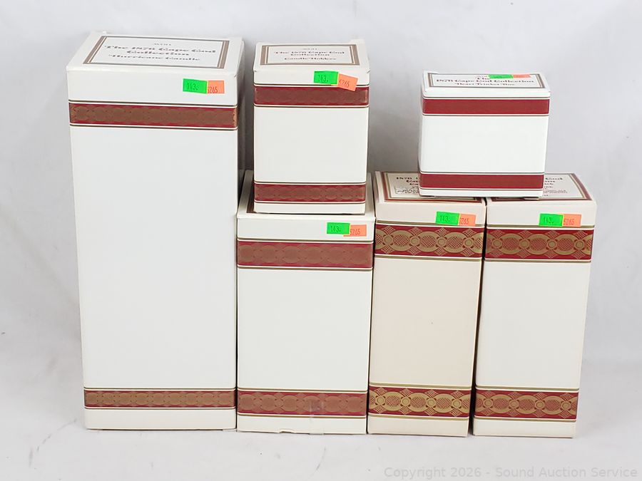 Candleholder, 2 Candlesticks, Hurricane Candle, Vase, Heart Trinket box. All with original boxes.