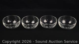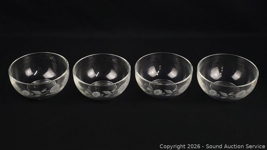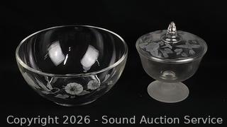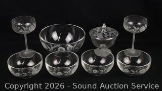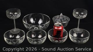 4 Crystal Dessert Bowls, Covered Candy Dish, Pair of Crystal Saucer Champagne glass set, Crystal Serving Bowl. All with original boxes.