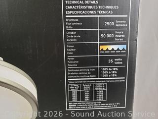 35W, 2500LM, 2700-5000K color. Works, has cracks in circular side cover. 3.07" x 14.94" Dia.