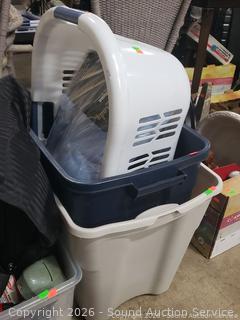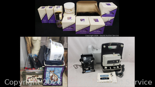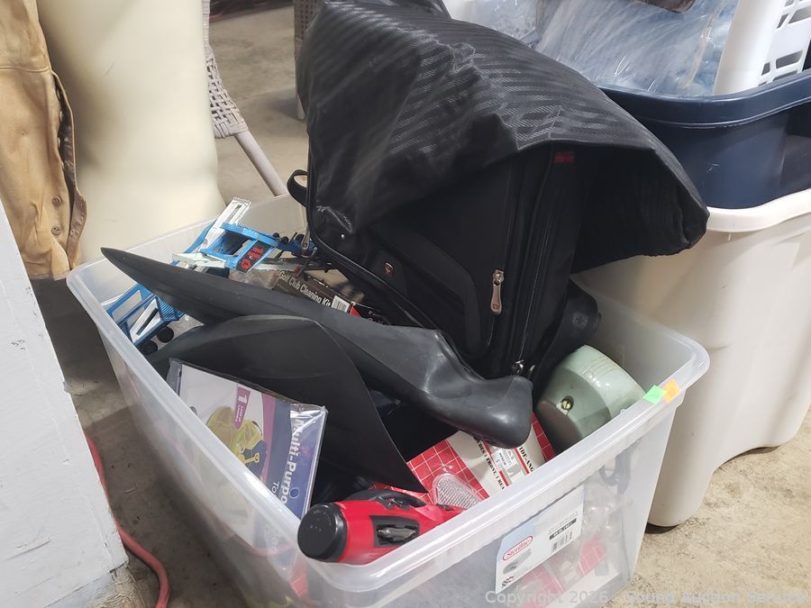 Laptop bag, 3 totes, laundry basket, swimming fins, golf club cleaning kit, multipurpose tote bag, 6V screwdriver, Yashica 8mm Editor & Elmo 8mm Projector (Editor has a cracked screen, not functioning. Projector is not projecting, not projecting from lens, motor appears to be functioning as intended), Assorted Perfect Resilience Facial Mask Beauty Products (Box of hair pins, 3 Porta Mask, 7 Masks), etc. Refer to photos for lot contents, more details.