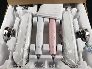 Have power, appear to be functioning as intended. 2 brushes, 1 tip, 2 charging glasses, 2 chargers.