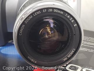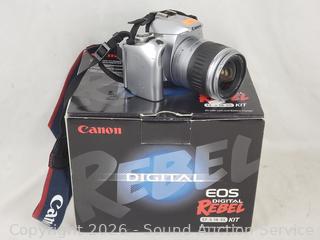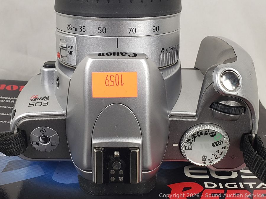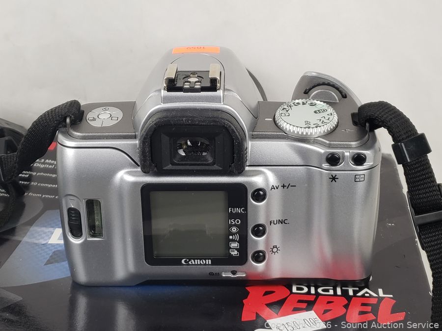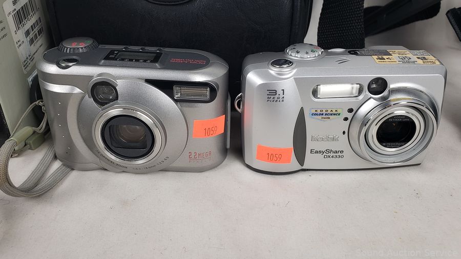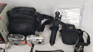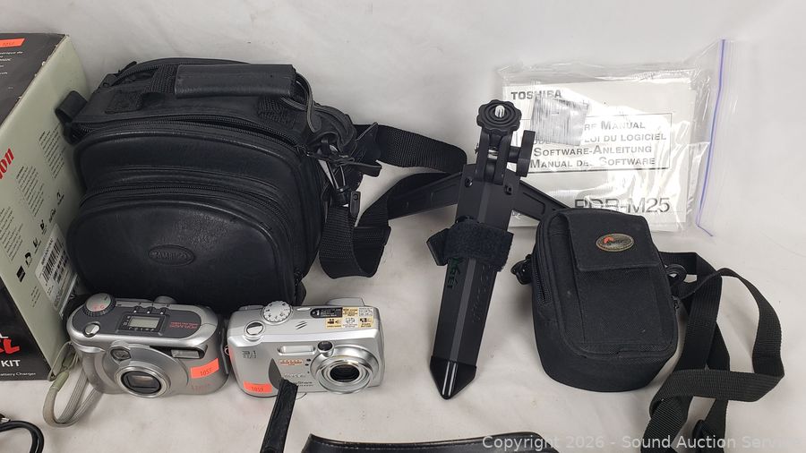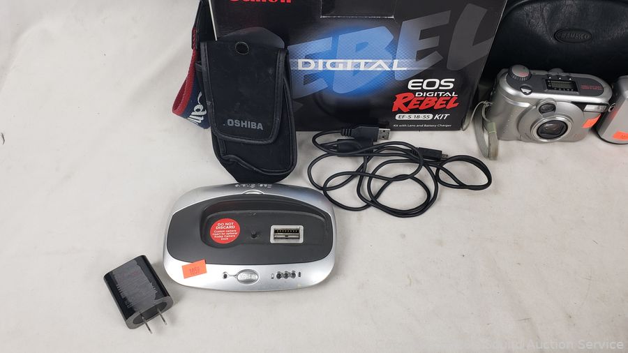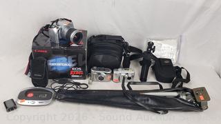 Tripods, Kodak Easy Share DX4330 (untested, no power cord), Toshiba PDR-M25 Digital camera (has power), Canon EOS Digital Rebel kit (untested, no batteries, comes with transfer cable), camera bags.