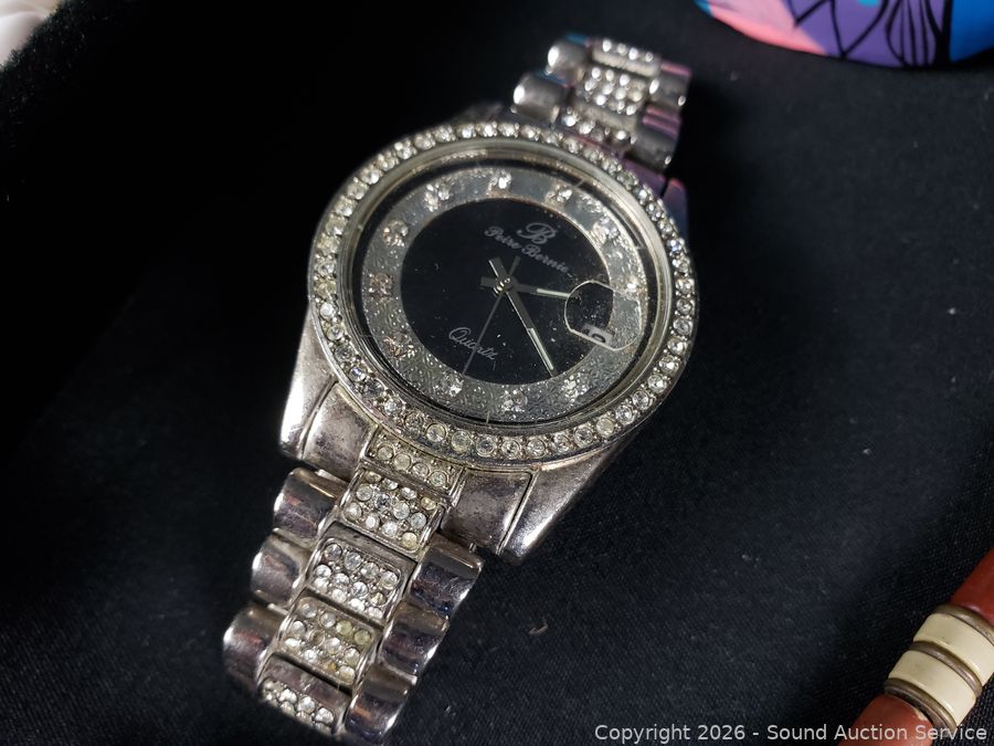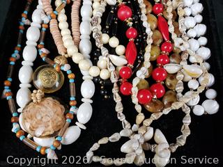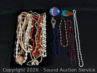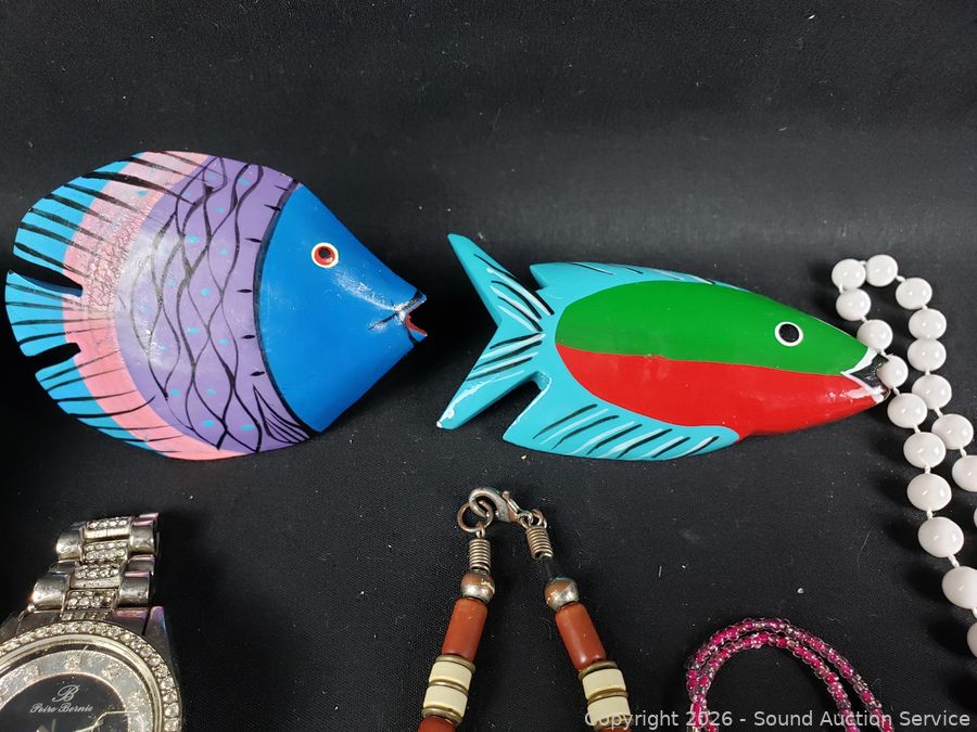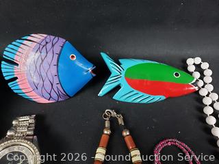 Necklaces, wood fish brooch & scarf, watch (missing the pin). Tray is not included.