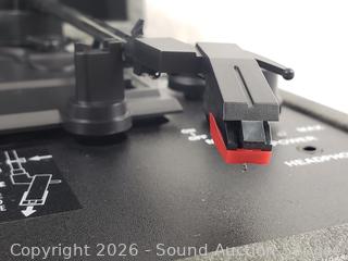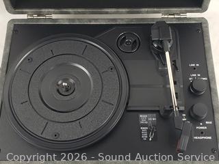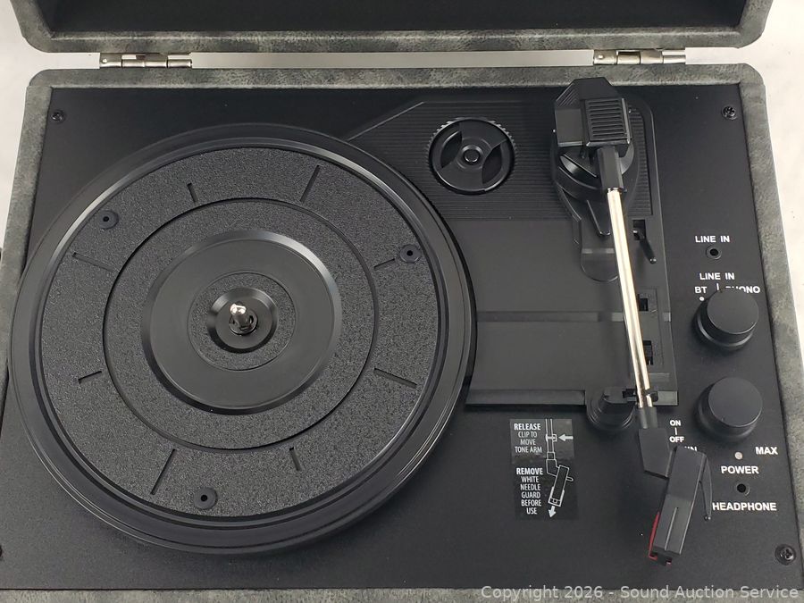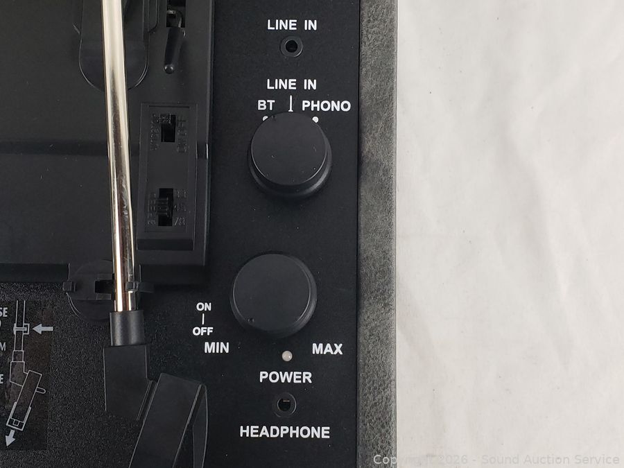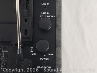 Has power, tested phono & bluetooth. Appears to be functioning as intended. Back panel w/power, power & audio inputs is loose.