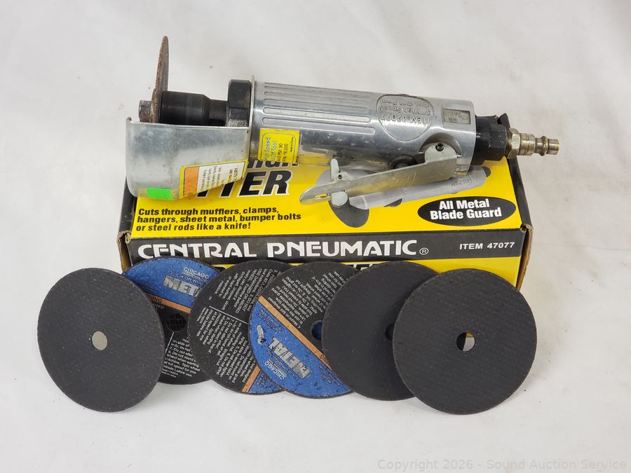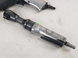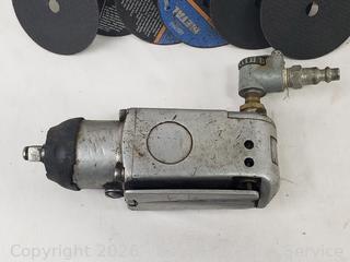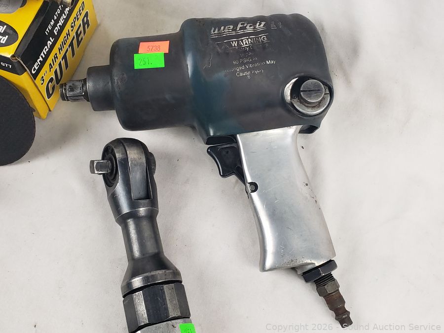 (2) 3/8" air ratchets, Central Pneumatic 3" cutter, 1/2" Blue Point impact. All appear to be functioning as intended. Signs of wear from use.