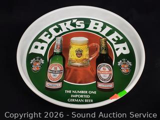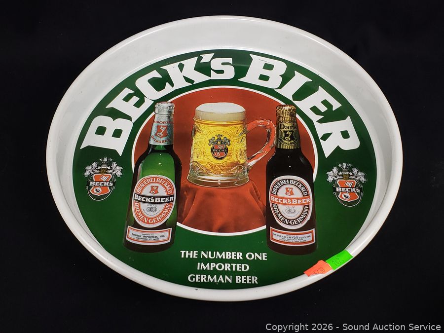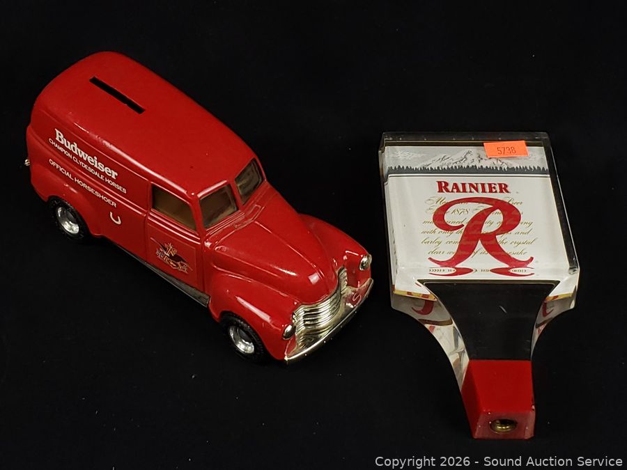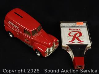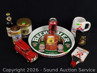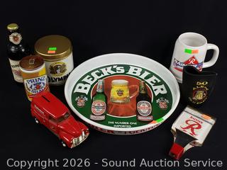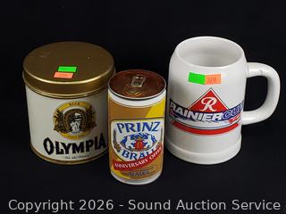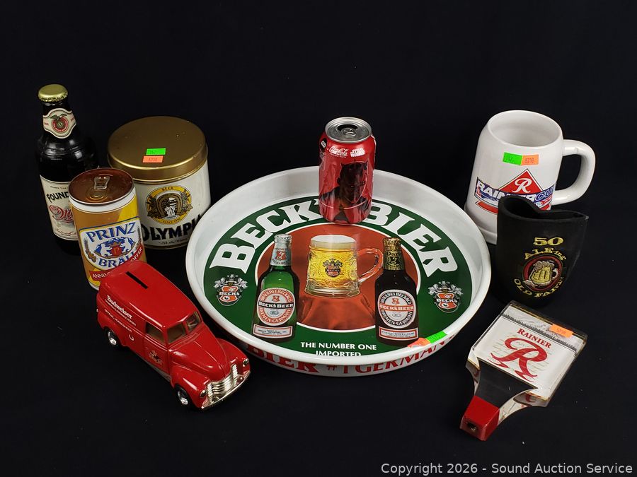 Beck tin tray, Olympia beer tin, Rainier mug, Budweiser vehicle coin bank, Rainier keg handle, Prinz can, Miller bottle.