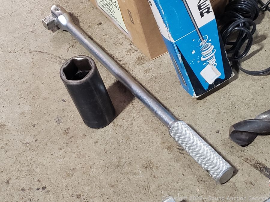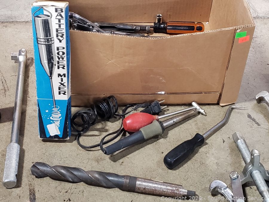 Soldering iron, several pullers, drill bits, battery power mixer, etc. Refer to photos for lot contents, more details.
