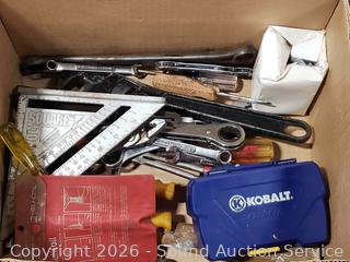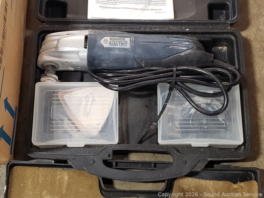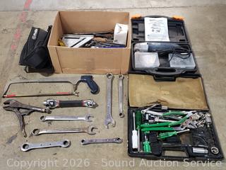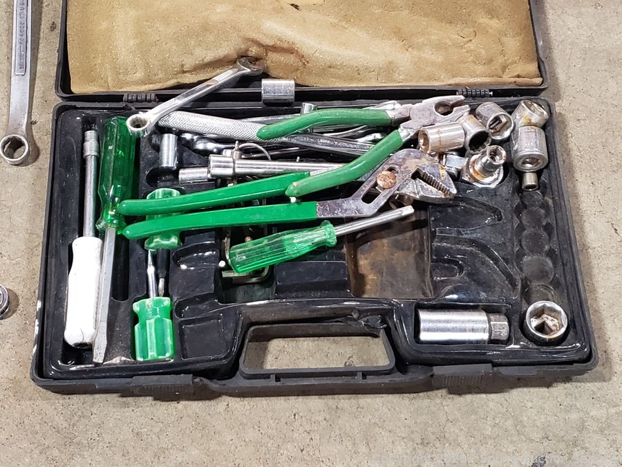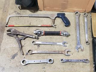 Chicago Elec. Multifunction tool, tool bag, hacksaw, Husky multi size socket wrench, wrenches, pliers, carpenter's squares, etc.