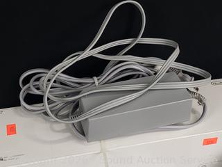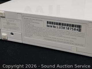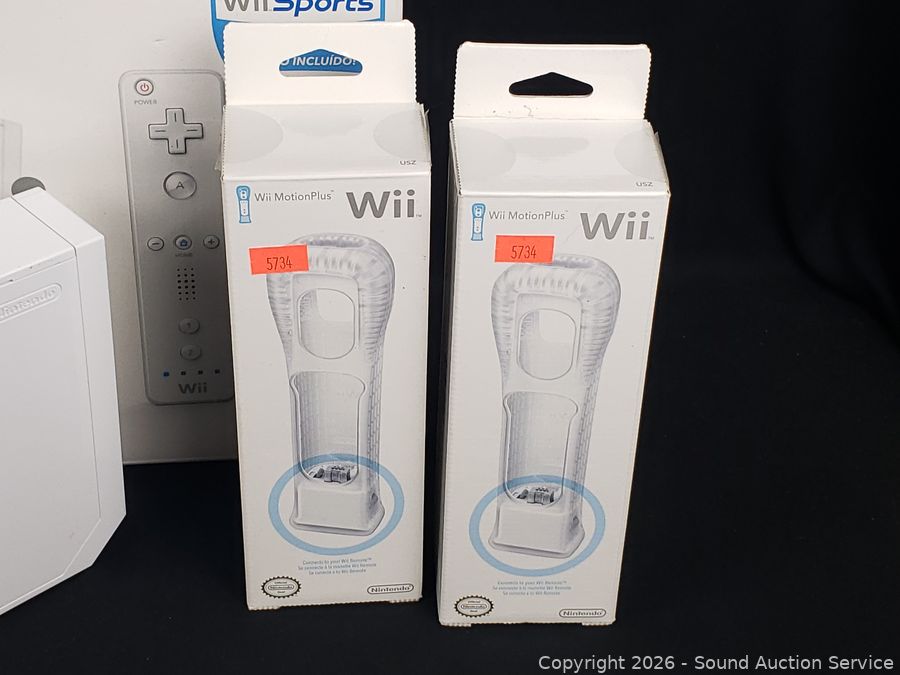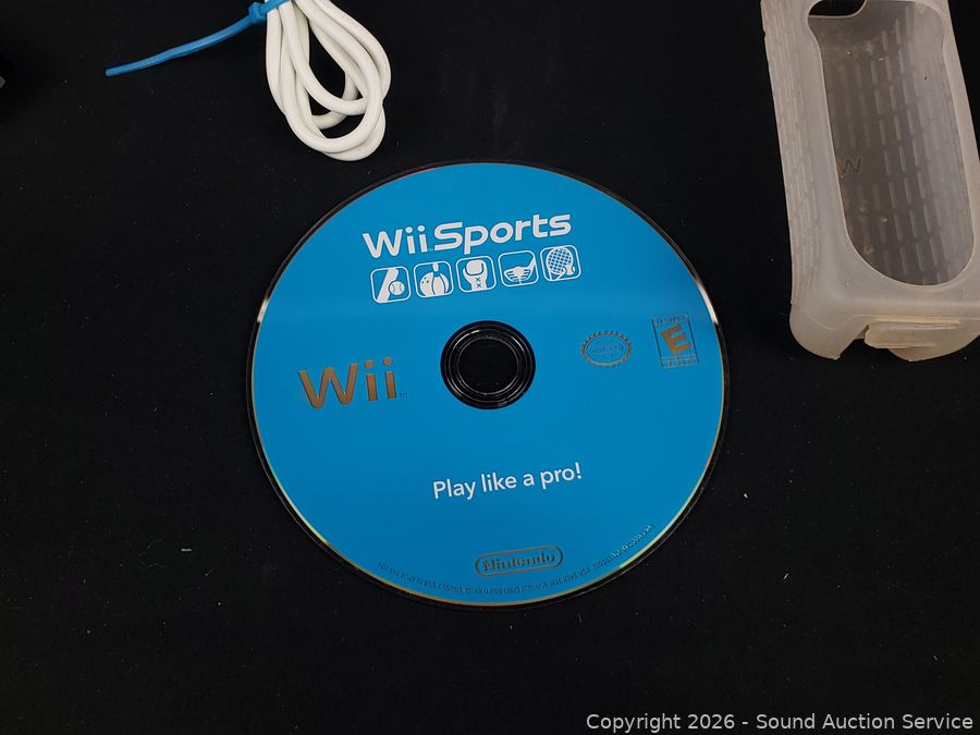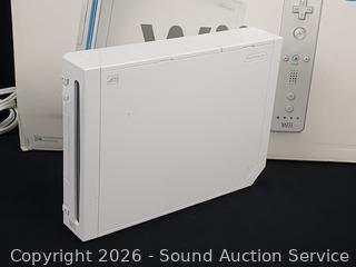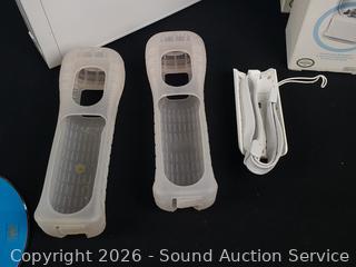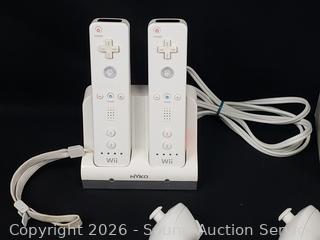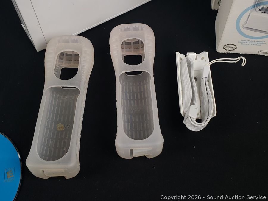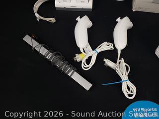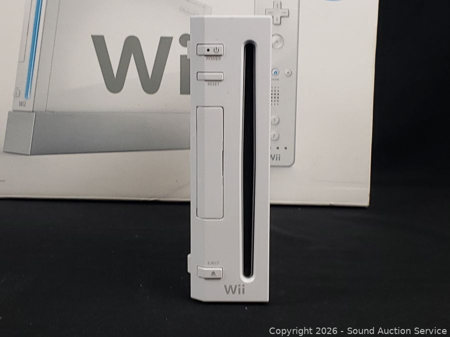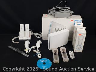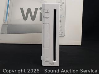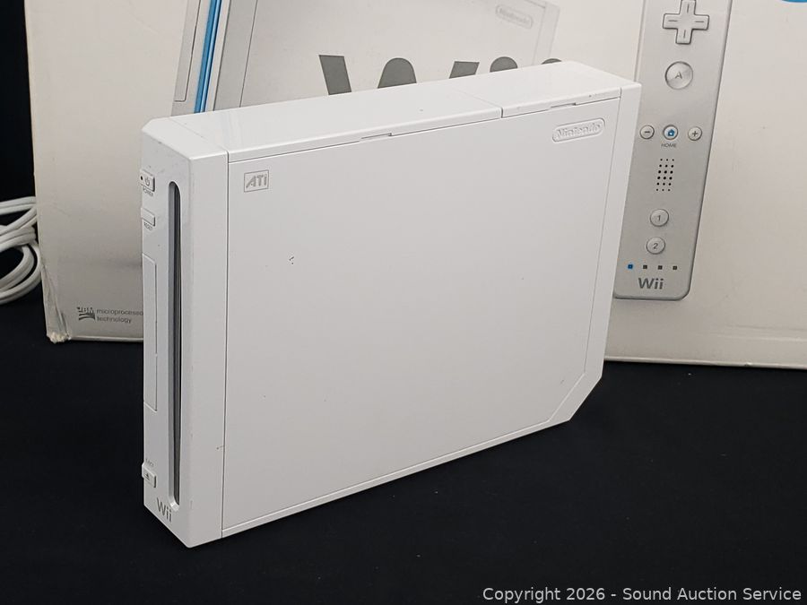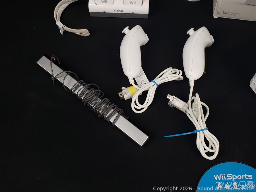 Has power, appears to be functioning as intended. Comes with 2 controllers, 2 nun-chucks, 2 power supplies, battery charger, 1 battery, one part is damaged. Comes with box.
