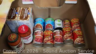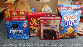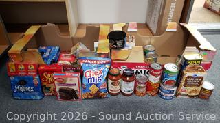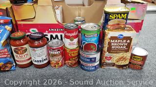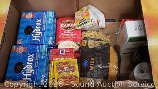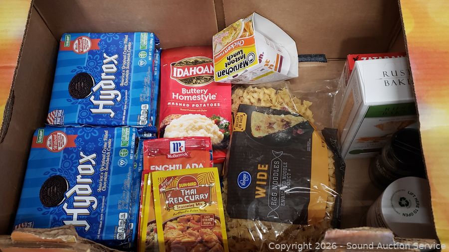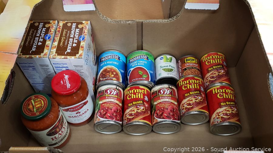 All withing best by date. Canned goods, cookies, noodles, instant potatoes, tuna, brown sugar, marinara, etc. Refer to photos for lot contents, more details.