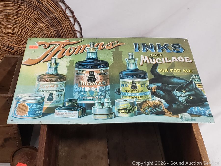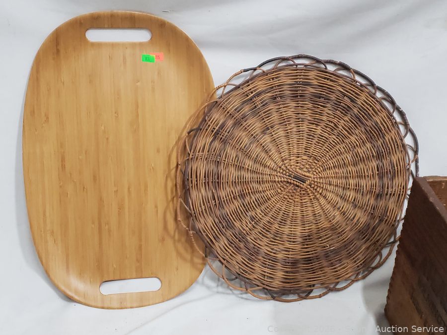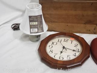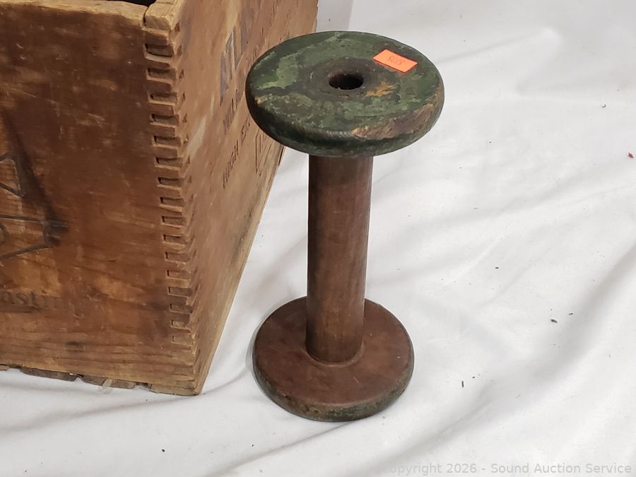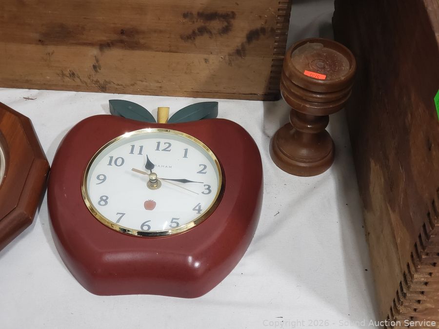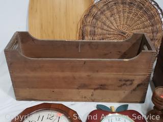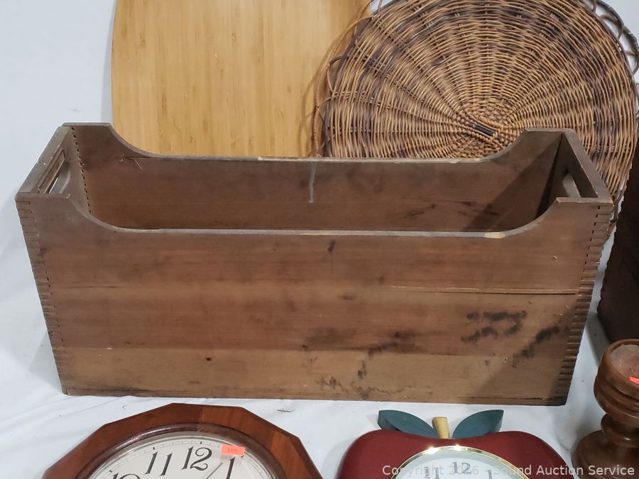 2 clocks, 1 lamp (work), Atlas Powder Crate 10" H x 17.5" x 12", Dovetail wood box 9.5" x 20.5" x 5.75", tin beer sign, bamboo tray, large spool. Refer to photos for more details.
