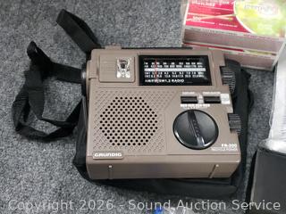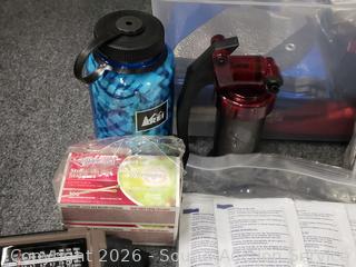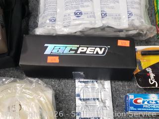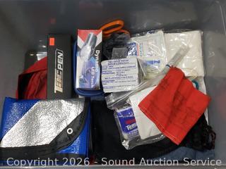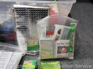 Emergency/Survival Drinking water, poncho, snap lights, blanket, fire starter, LED torch, matches, toothbrushes, radio (works), etc. Refer to photos for lot contents, more details.