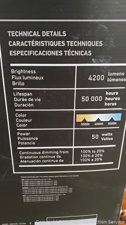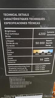 Integrated LED's, 50W, 4200LM, 3000-5000K color. 1/2" x 12" x 48". Both works, don't see any issues.