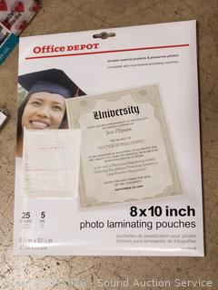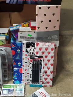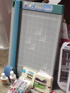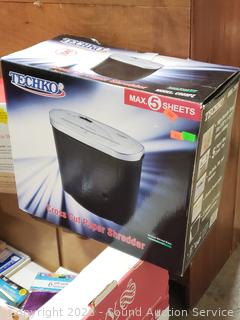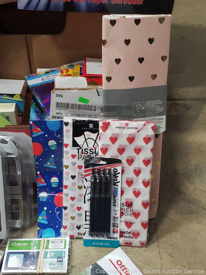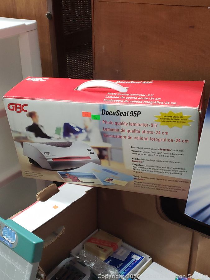 GBC DocuSeal 95P Photo Laminator (has power, untested), Techko Paper Shredder (works), 12" rotary trimmer, gel ink pen, tissue paper, gift bags, post-it notes, etc. Refer to phots for lot contents, more details.