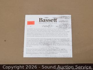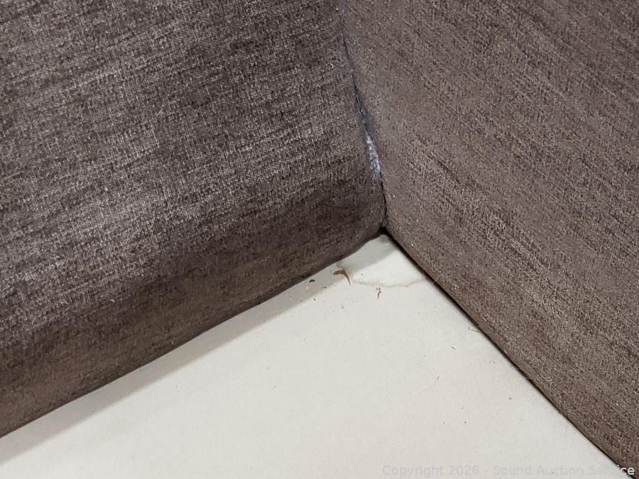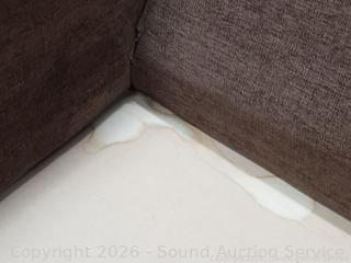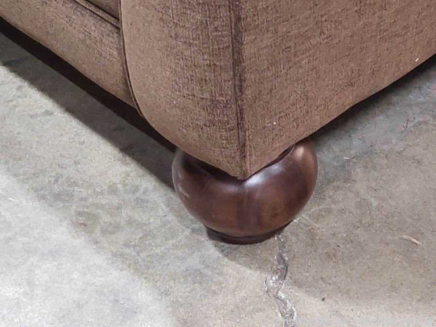 Hole on backside of right armrest. Some minor dirty spots, wear to finish. 30" H x 80" W x 38" D x 19" to seat.