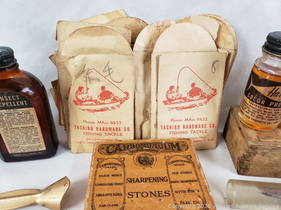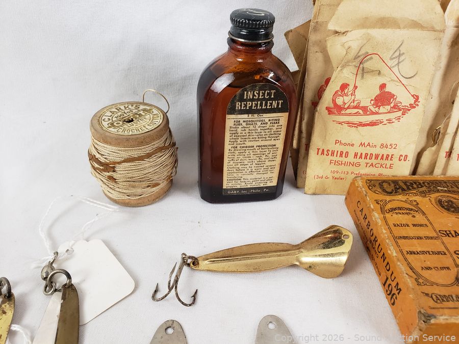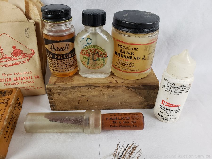 Large hook, sharpening stone, insect repellent, line, dressing, reel grease, etc. Refer to photos for lot contents, more details.
