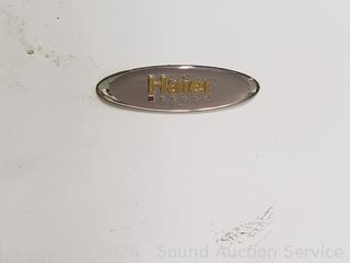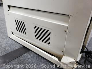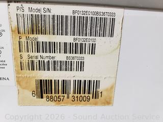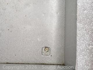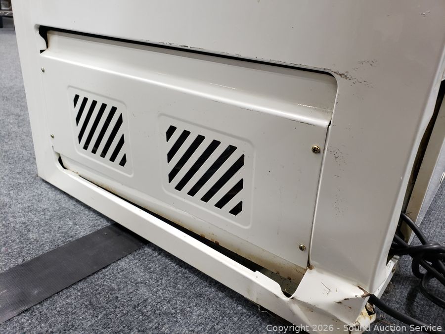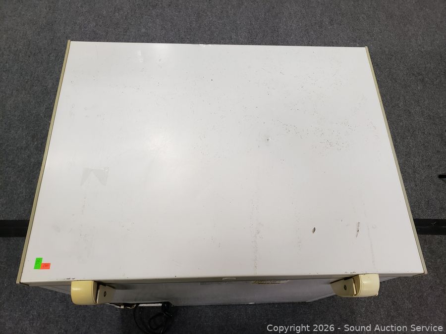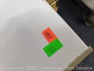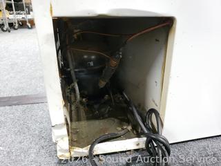 Has damage on side at bottom, some dents, scratches throughout. Could use a deep cleaning. 32" H x 29" x 22".