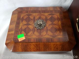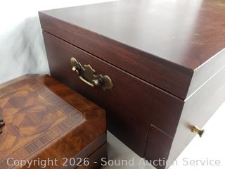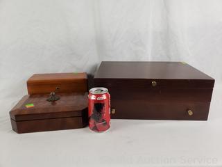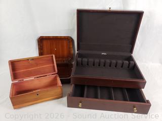 2.75" x 9" x 7" cigar box, 5.75" H x 14.5" W x 10.5" D silverware chest, 4" H x 9" x 4.5" Lane chest. Refer to photos for lot contents, more details.