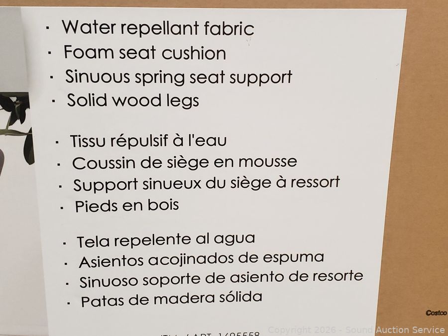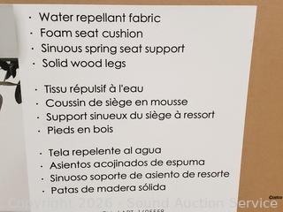 Water repellant fabric, foam seat cushion solid wood legs. 34.2" H x 19.6" W x 24" D. Appears to be new in original packaging. #1965558.